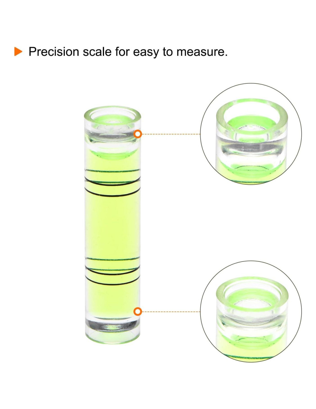 Nivel de burbuja pequeño de 9.5mm de diámetro y 40mm de grosor. Herramienta de nivelación universal, carcasa en PMMA y plástico ABS, duradera y fácil de usar. Este nivel de burbuja cilíndrico se puede montar en muchos equipos para una nivelación muy conveniente. Adecuado para ajustar cámaras, montajes de trípodes, tocadiscos estéreo, reproductores de discos, altavoces, fotografías, telescopios, decodificadores, colgar imágenes, medir en carpintería, maquinaria de fábrica, etc. Fácil de llevar y almacenar, se adapta bien a una bolsa de herramientas o en su bolso como herramientas de medición de bolsillo.