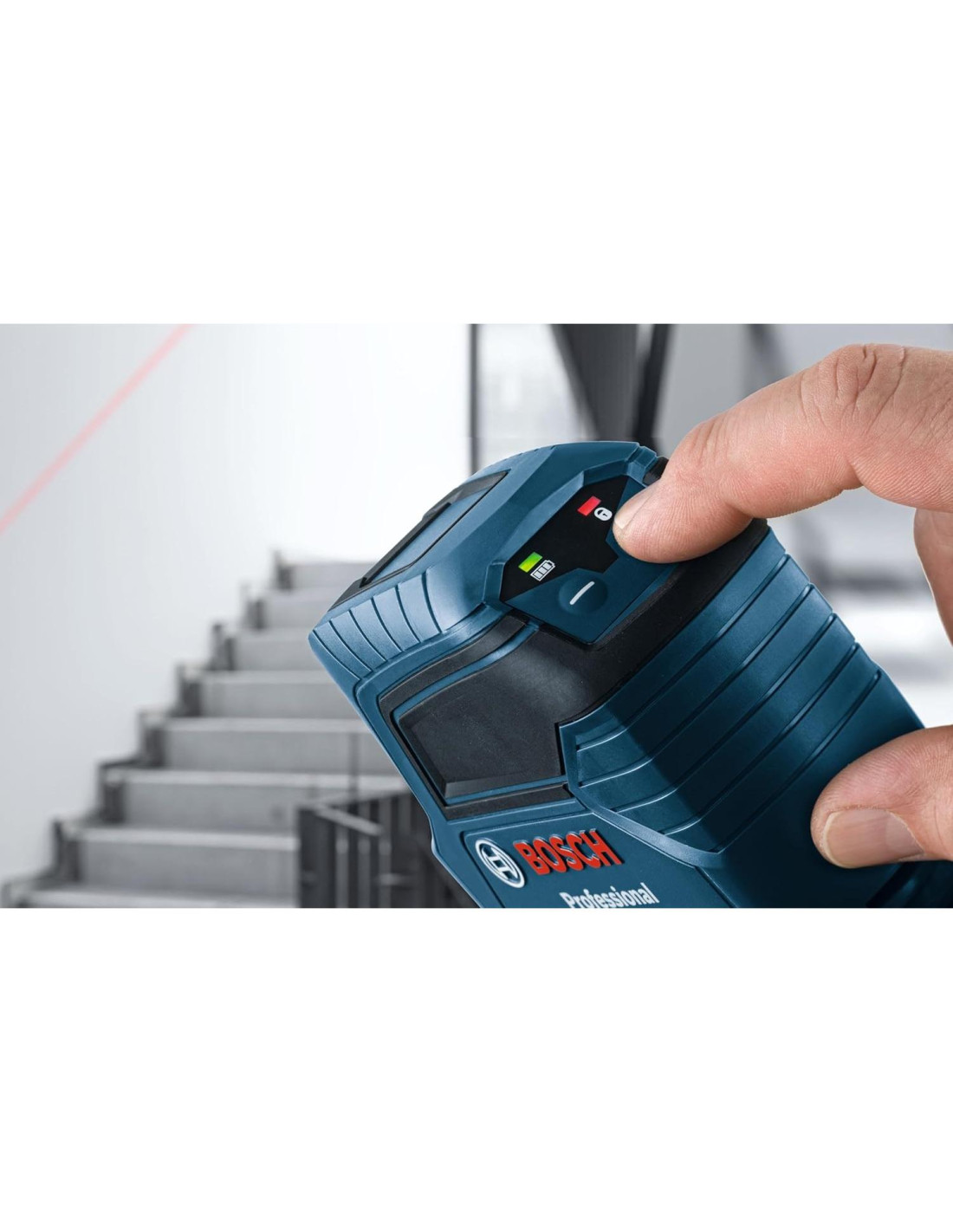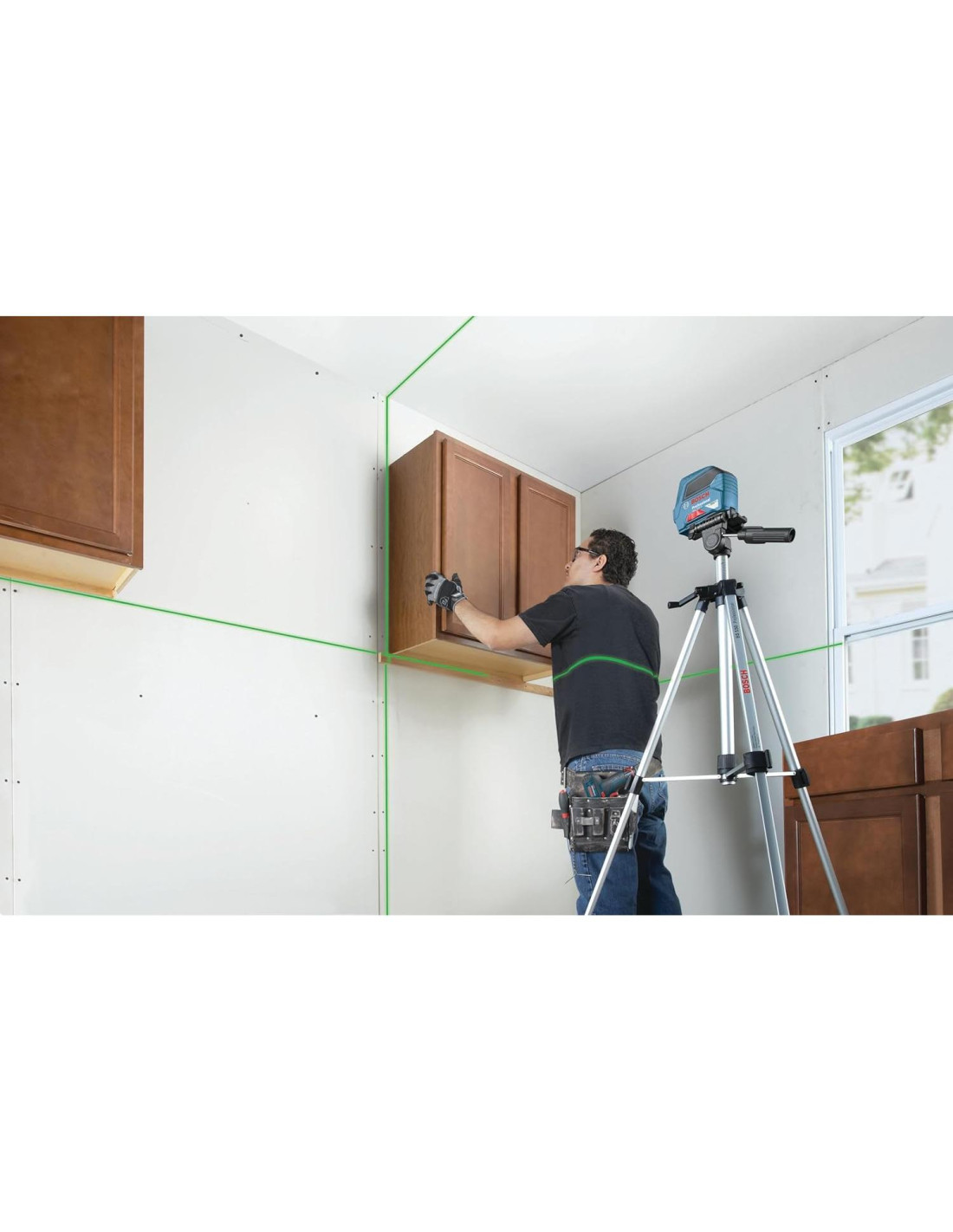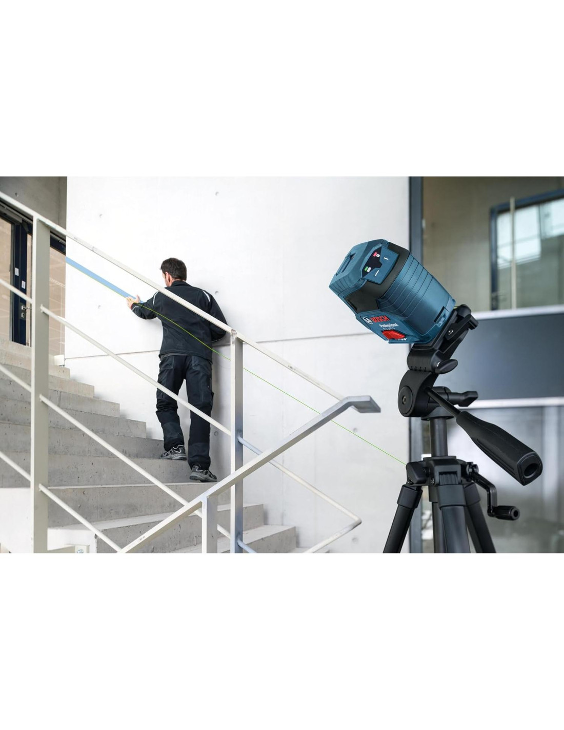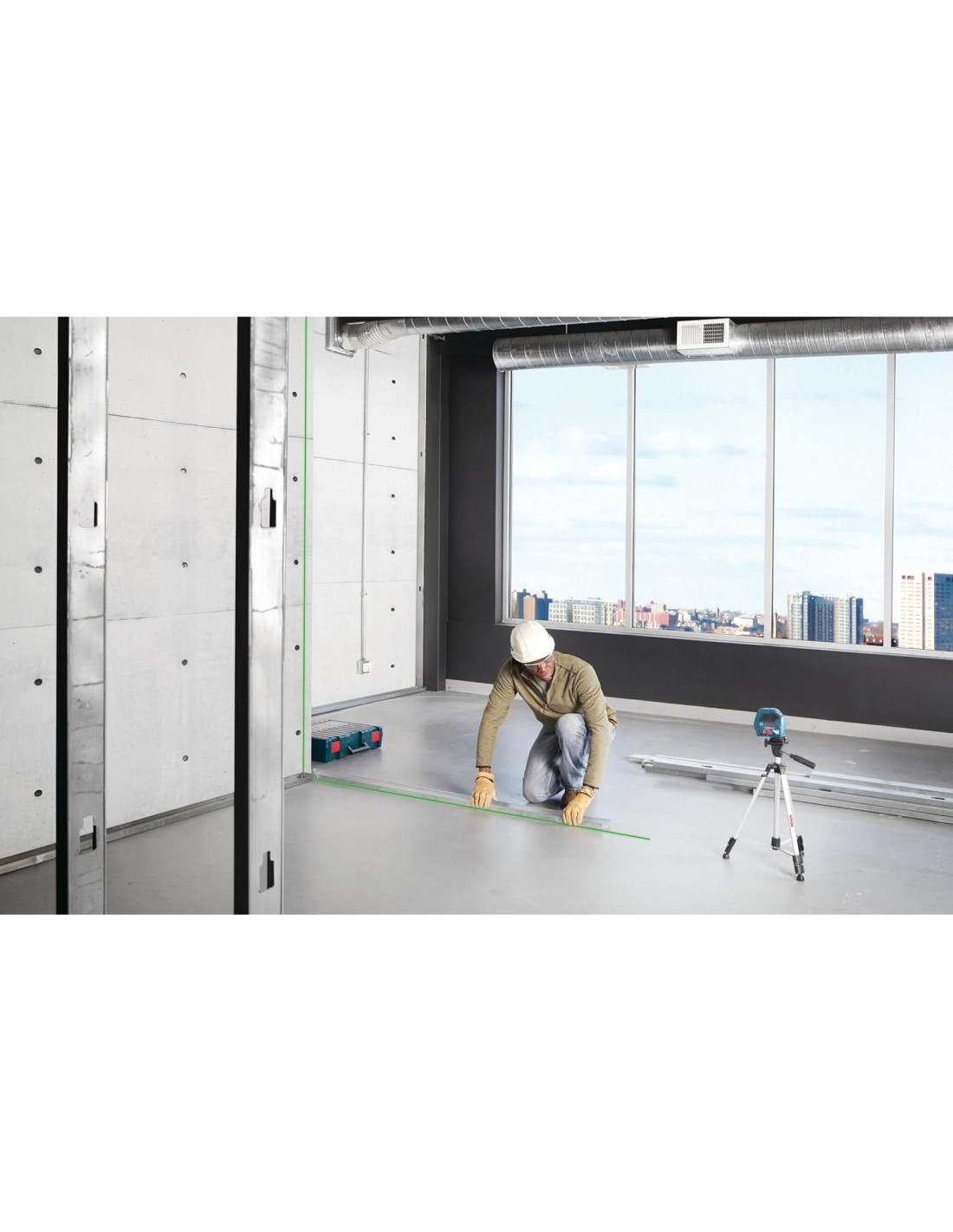 El láser de línea cruzada auto-nivelante de haz verde Bosch GLL 100 GX presenta un láser con modos vertical, horizontal y de línea cruzada. El láser proyecta dos líneas de forma independiente o juntas, para una amplia gama de aplicaciones de alineación y nivelación. Incluye la tecnología exclusiva VisiMax, que permite una visibilidad excepcional de la línea en condiciones de trabajo estándar. Monitorea constantemente la temperatura del láser para que los diodos siempre se mantengan en la máxima visibilidad de línea, mientras protege los diodos láser del sobrecalentamiento. Los haces verdes son hasta 4 veces más brillantes que los haces rojos estándar, lo que le da a la herramienta un rango de trabajo de hasta 100 pies (30,48 m). La herramienta ofrece una precisión de +/- 1/8 pulgadas (0,32 cm) a 33 pies (10,06 m) y +/- 3/8 pulgadas (0,95 cm) a 100 pies (30,48 m). El sistema de péndulo inteligente Bosch se auto-nivela e indica condiciones fuera de nivel, para ayudar a garantizar un diseño preciso. Bloquea el péndulo después de que el láser se apaga para un transporte seguro. El láser está construido con una resistente construcción sobre-moldeada con una clasificación IP 54 para proteger contra el polvo y el agua. El dispositivo de posicionamiento BM3 incluido ofrece una configuración rápida en aplicaciones de rejilla de techo y modo independiente con sus patas retráctiles y ajuste de altura microfino. El paquete también incluye una bolsa resistente.