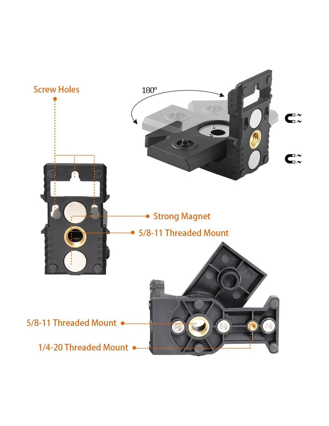 - Hilo macho de 1/4" se monta en el dispositivo de nivel láser, hilo hembra de 5/8" se monta en trípodes, agujeros adecuados para el punto láser.