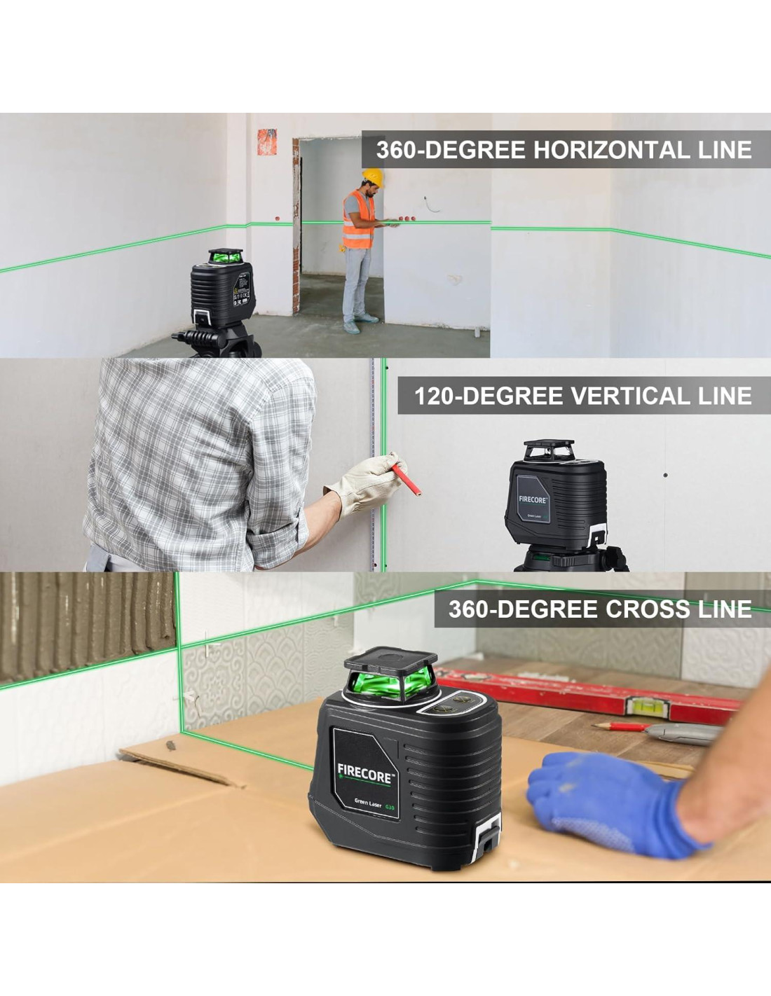 - Línea cruzada horizontal de 360 grados: Con un rayo horizontal de 360 ultra brillante y un rayo vertical de 120 proporciona cobertura de nivelación en todas direcciones. El plano horizontal de 360 y la línea vertical se pueden proyectar por separado o juntos para una variedad de aplicaciones, te da la máxima luminosidad del láser verde hasta 82 pies (24,99 m) con alta precisión para facilitar la medición