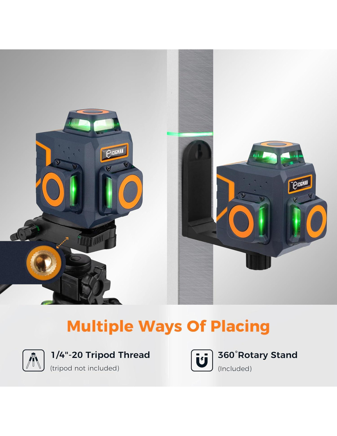- Rosca de montaje de 1/4"-20 y soporte magnético de 360: La base incluye una rosca de 1/4"-20 para montaje en trípode. El soporte magnético fuerte de 360 incluido admite roscas de 1/4"-20 y 5/8"-11, permitiendo una rápida sujeción a superficies metálicas. Dos anclajes de agujero colgante ofrecen opciones de montaje adicionales, perfectas para tareas como colgar cuadros, empapelar, trabajos de techos suspendidos y más. Este nivel láser está diseñado para flexibilidad y precisión.