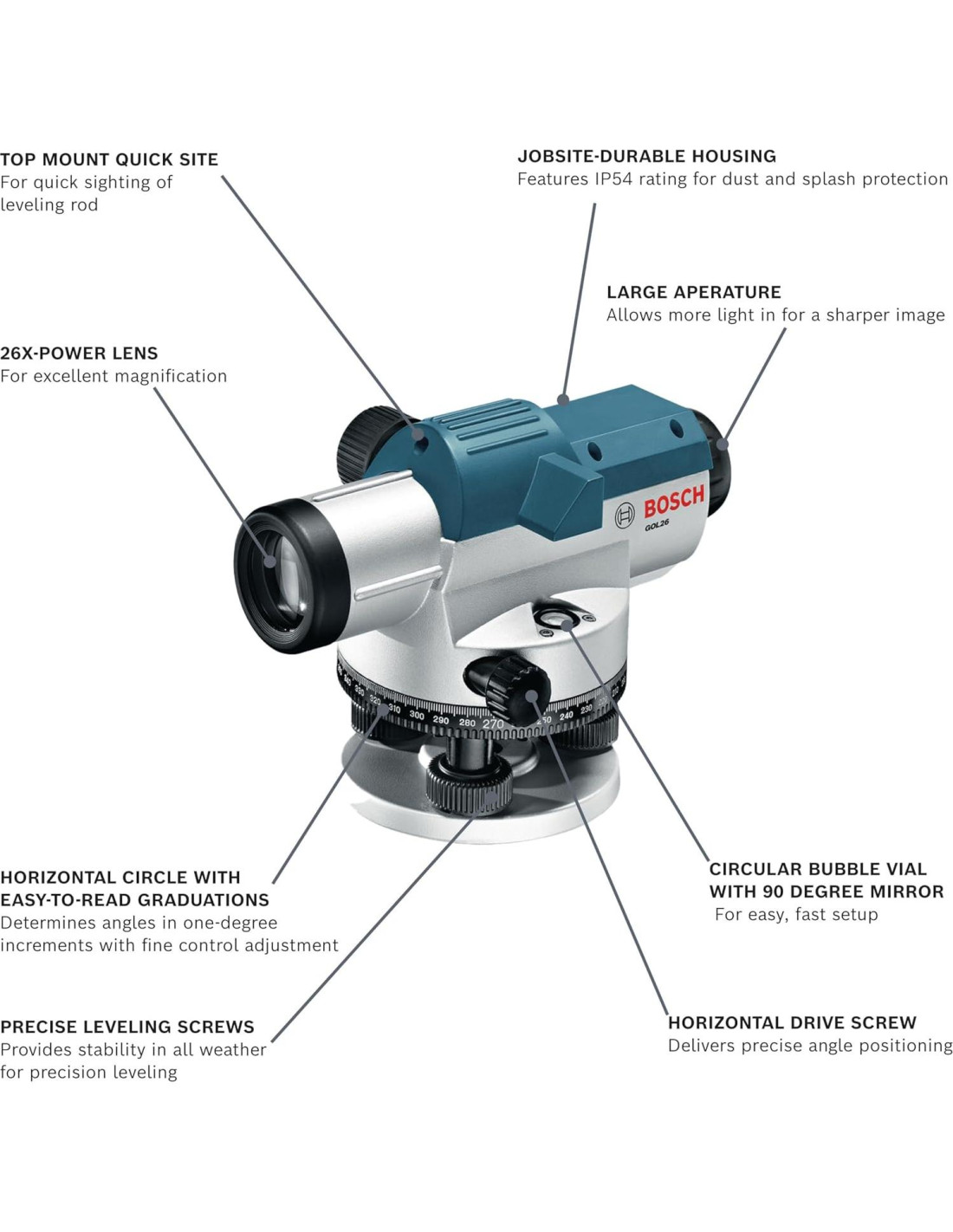 - FÁCIL DE USAR: Equipado con un vial de burbuja circular con espejo de 90 grados para una configuración fácil y rápida.