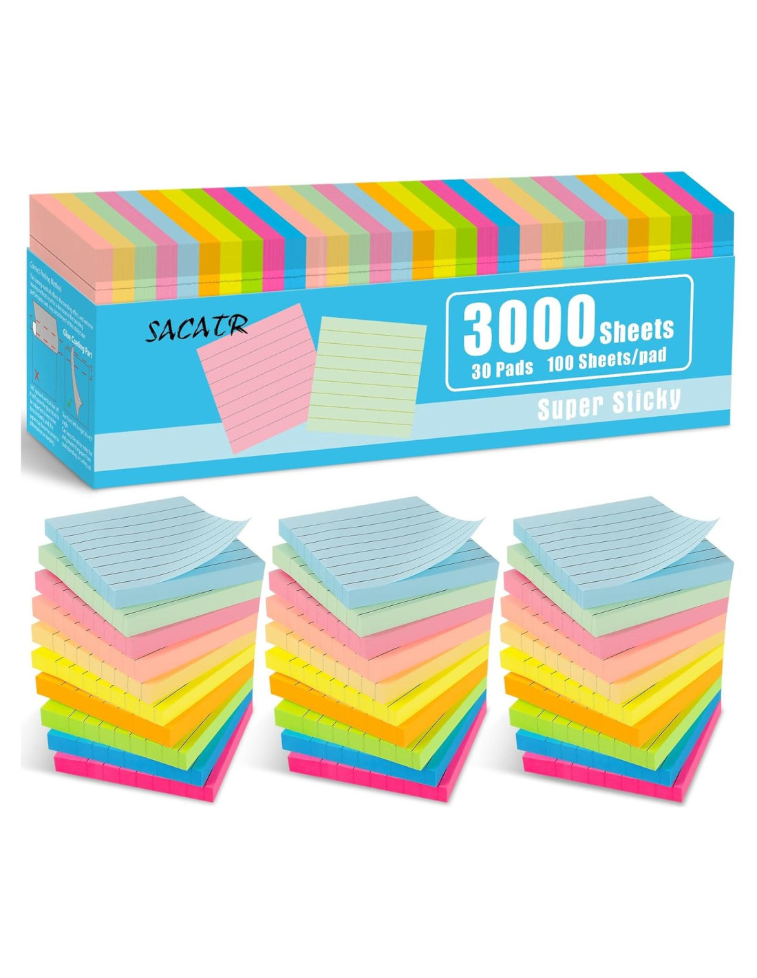 - [Notas Adhesivas con Líneas] Notas adhesivas rayadas 3x3 pulgadas (7.62x7.62 cm), 30 blocs, 100 Hojas/papel, totalizando 3000 hojas. Estas notas adhesivas rayadas están listas para ayudarte a mantenerte organizado y eficiente en cada esfuerzo.