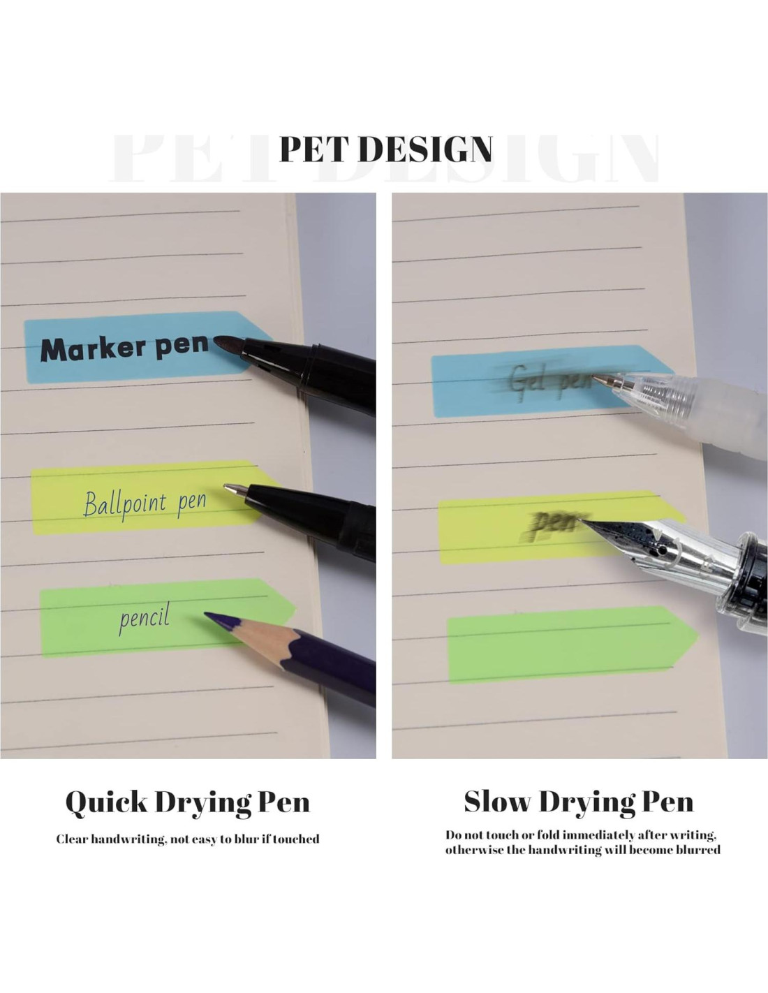 - [ESCRIBIBLE Y REPOSICIONABLE] La etiqueta es medio autoadhesiva y se puede reposicionar para facilitar el pegado y marcado, y la limpieza. Diferentes bolígrafos traen diferentes efectos a las notas adhesivas, (bolígrafos de secado rápido: bolígrafos de bola, lápices, marcadores; bolígrafos de secado difícil: plumas estilográficas, bolígrafos de gel, bolígrafos a base de tinta, etc).