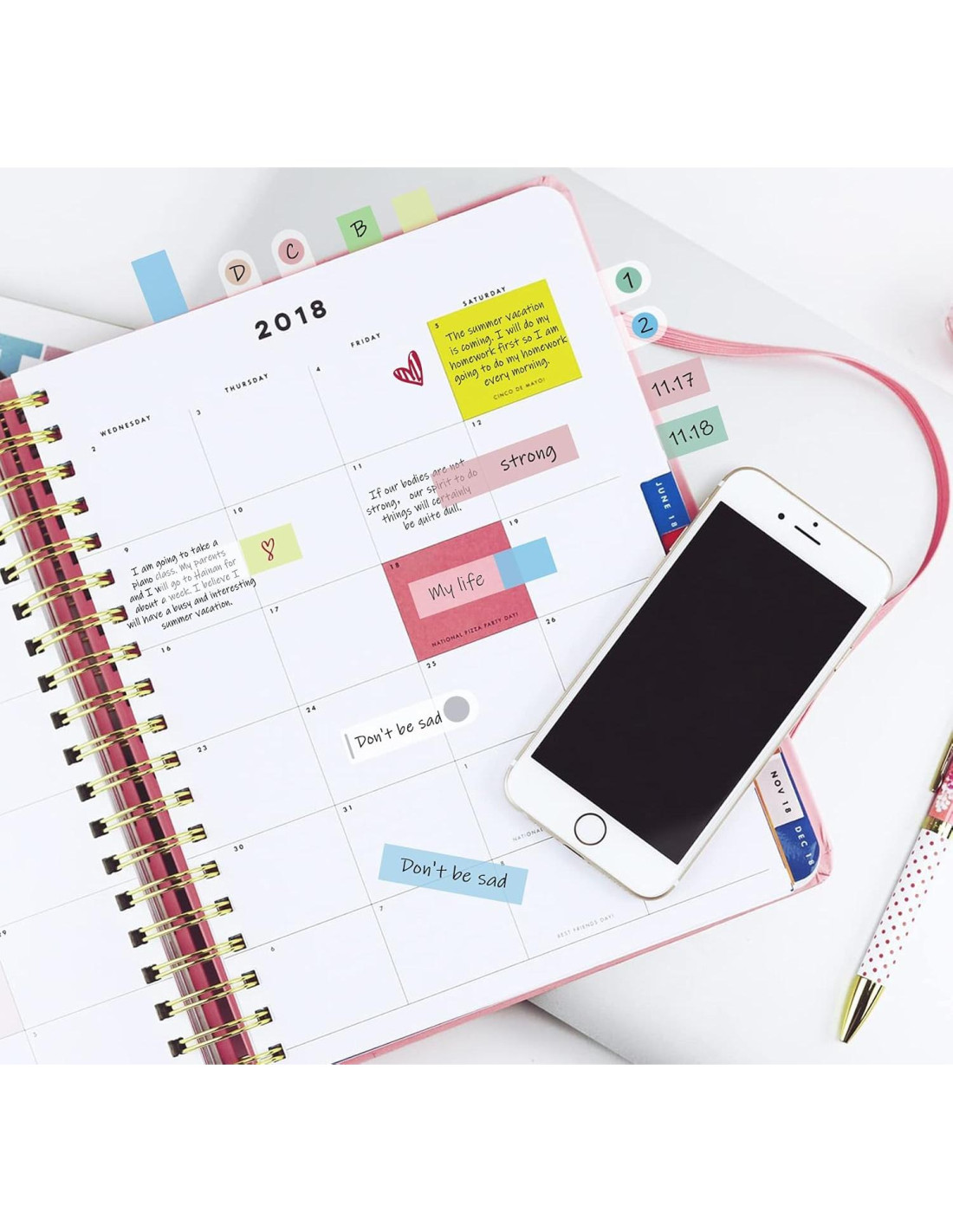 - Tiras semi-transparentes removibles: Adhesivo removible para fácil reposicionamiento, puedes despegarlo sin rasgar el papel o la página.