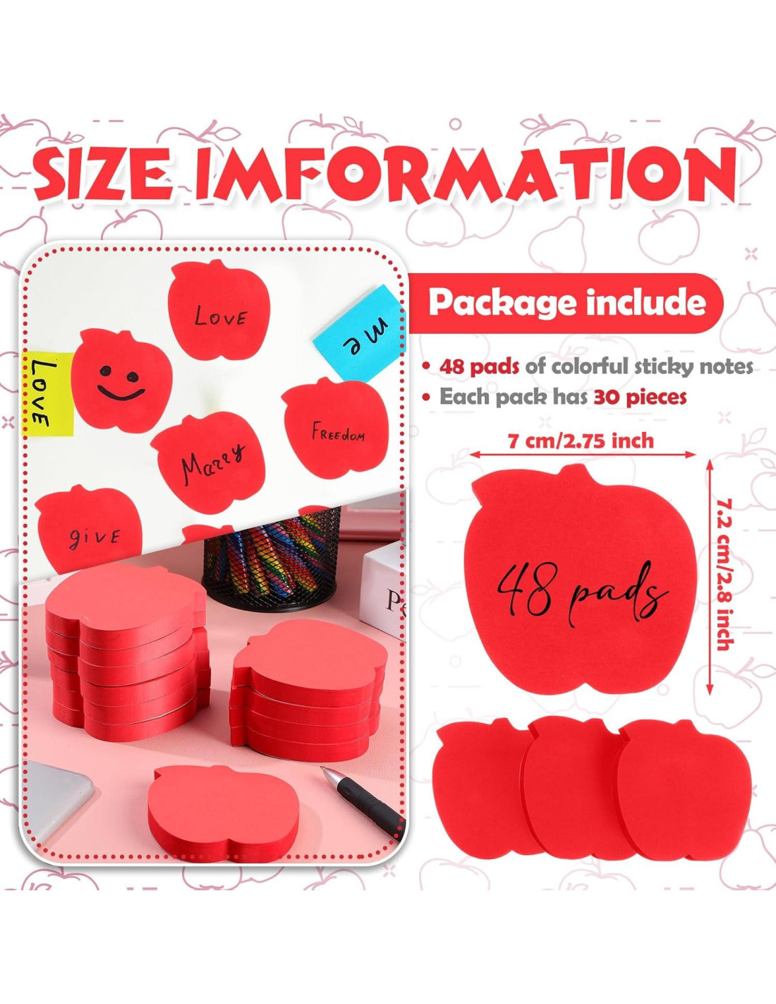 - El paquete incluye: disfruta de un refrescante toque de color en tu espacio de trabajo con nuestras notas adhesivas en forma de manzana; El paquete contiene 48 notas adhesivas en forma de manzana, cada una con 100 Hojas; Diseñadas para dejar una impresión duradera, estas notas adhesivas sin duda alegrarán tu día y tus tareas