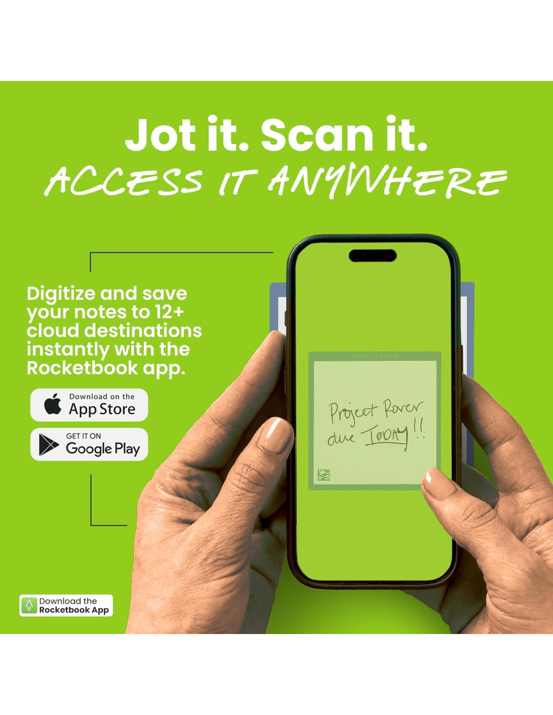 - Escribir, Escanear, Borrar y Re-Adherir: Escribe notas con un bolígrafo FriXion, escanea múltiples notas a la vez con la app Rocketbook para guardarlas digitalmente, limpia con una toalla y agua, luego lava el adhesivo reutilizable para volver a pegar una y otra vez según sea necesario.
