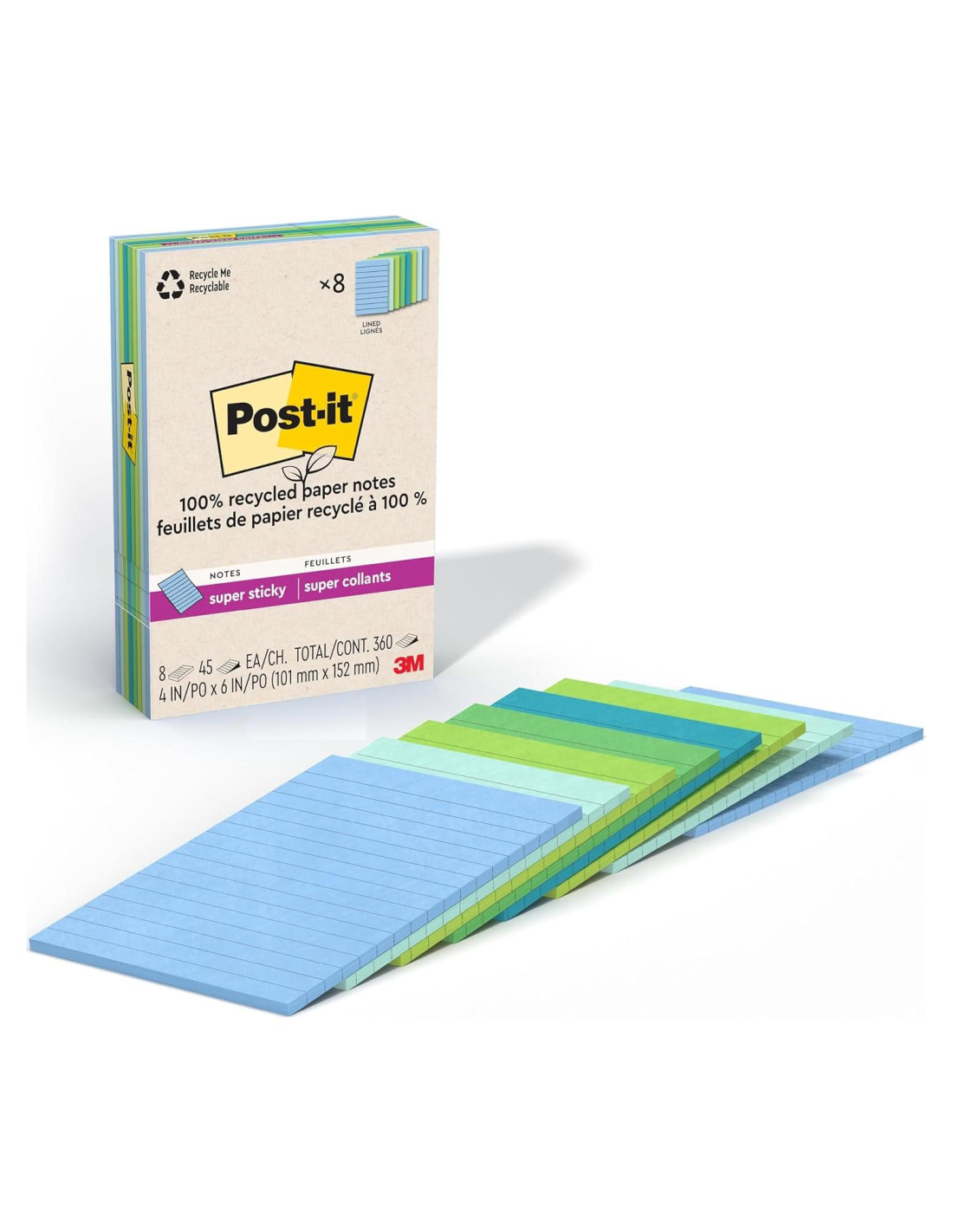 Mantén la calma y la concentración con los suaves azules y verdes de la Colección Oasis de Notas adhesivas Super Sticky Post-it, hechas con papel 100% reciclado. Ya sea anotando tus tareas diarias, generando grandes ideas, estudiando o estableciendo recordatorios, los colores y las ideas siempre son más brillantes juntos. Estas notas adhesivas cuentan con el doble de poder de adherencia. También se adhieren y se pueden volver a pegar, lo que te permite mover tus notas contigo a lo largo del día. Son ideales para paredes, puertas, ventanas y otras superficies verticales, y como todas las Notas Post-it, se adhieren de forma segura pero se retiran limpiamente sin dañar. Mantén tus ideas en tus cuadernos, libros de clase, calendarios u otros documentos. No se necesita cinta ni chinchetas con el adhesivo a base de agua en estas notas, ahorrándote dinero y tiempo en productos de oficina o suministros escolares. Un gran bloc de notas, son ideales para usar para notas o recordatorios para ti mismo o para otros. Las Notas adhesivas Super Sticky Post-it son la solución perfecta para listas de compras, recordatorios, notas en pantallas de computadora, seguimiento del tiempo, listas de tareas, marcando cables, codificación por colores de documentos, recordando a los niños que hagan sus tareas, guionizando, papel de borrador y procesamiento ágil. Cada hoja de notas mide aproximadamente 10.16 cm x 15.24 cm, rayada con 45 hojas por bloc y 8 blocs de notas adhesivas por paquete. Estas notas adhesivas son de la Colección Oasis que incluye Denim Lavado, Menta Fresca, Limeade, Verde Suerte y Vidrio Marino. Las Notas adhesivas Super Sticky de papel 100% reciclado Post-it y su empaque son 100% reciclables en la acera.