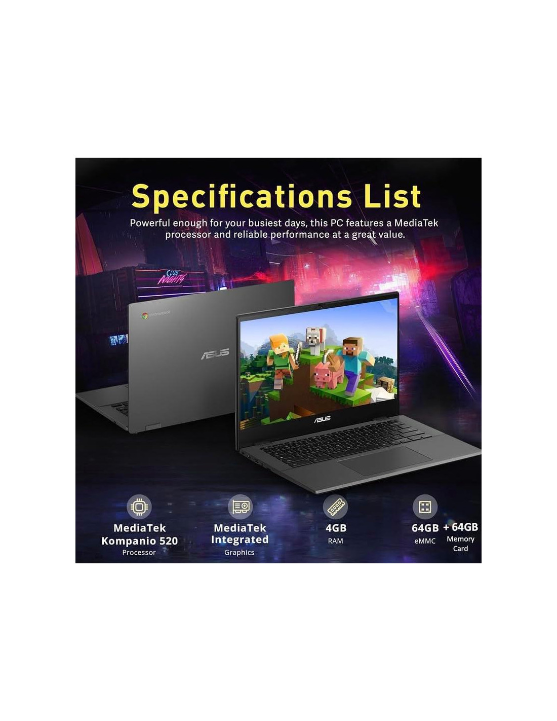 - [MediaTek Kompanio 520 de 8 Núcleos] 1M Caché, hasta 2.0 GHz, 8 núcleos. Un eficiente procesador MediaTek Kompanio 520 y hasta 15 horas de duración de la batería ofrecen tiempos de arranque rápidos y un rendimiento receptivo para aplicaciones modernas de productividad y colaboración que los usuarios de Chromebook de negocios exigen.