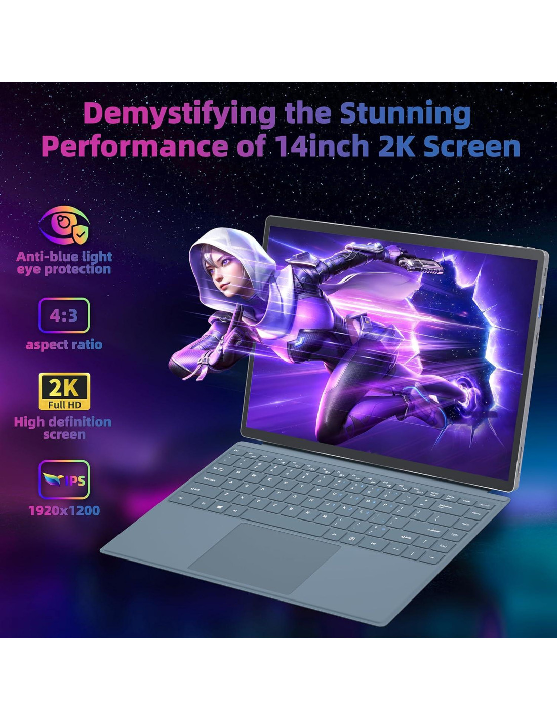 - [Laptop Avanzada 2K] La laptop está equipada con una pantalla IPS de 2K (1920 x 1200). Permite a los usuarios disfrutar de una experiencia visual vibrante. La pantalla de 2K tiene una mayor densidad de píxeles, presentando imágenes y texto más claros y delicados. Junto con una pantalla grande de 14 pulgadas, puedes experimentar una claridad y amplitud más inmersivas. Este diseño ayuda a reducir la fatiga ocular, es adecuado para su uso y aprendizaje en diversos entornos, y no se ve fácilmente afectado por la luz.
