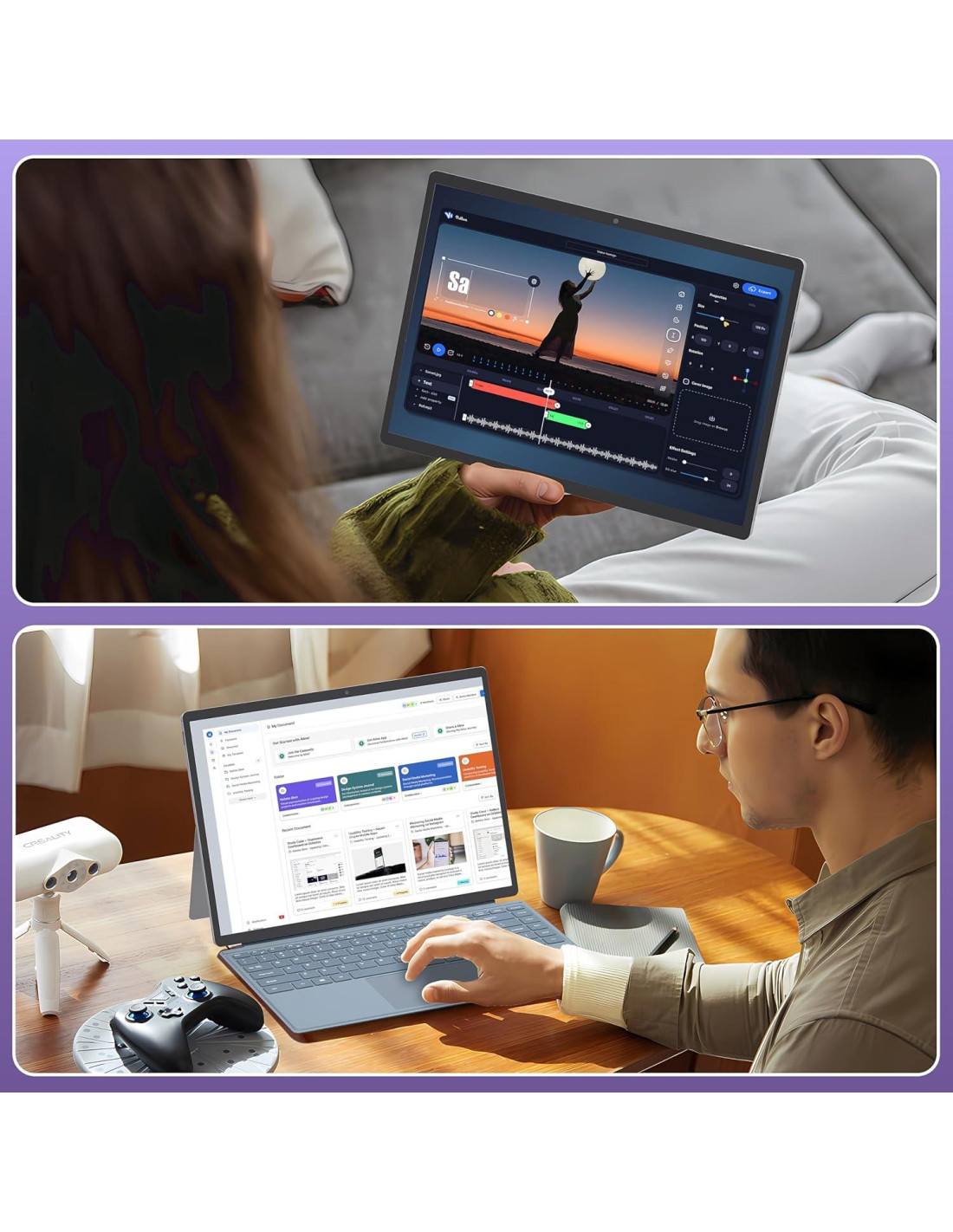- [Pantalla táctil y teclado desmontable] La pantalla táctil proporciona una forma más intuitiva de operación, permitiendo a los usuarios realizar diversas operaciones tocando suavemente, deslizando o pellizcando la pantalla con sus dedos. El teclado magnético desmontable se puede conectar al teclado a través de alineación magnética. Esta computadora es muy amigable para el usuario, con un soporte metálico plegable en la parte posterior que se puede ajustar de 0 a 150 , permitiendo un cambio libre entre tabletas y laptops.