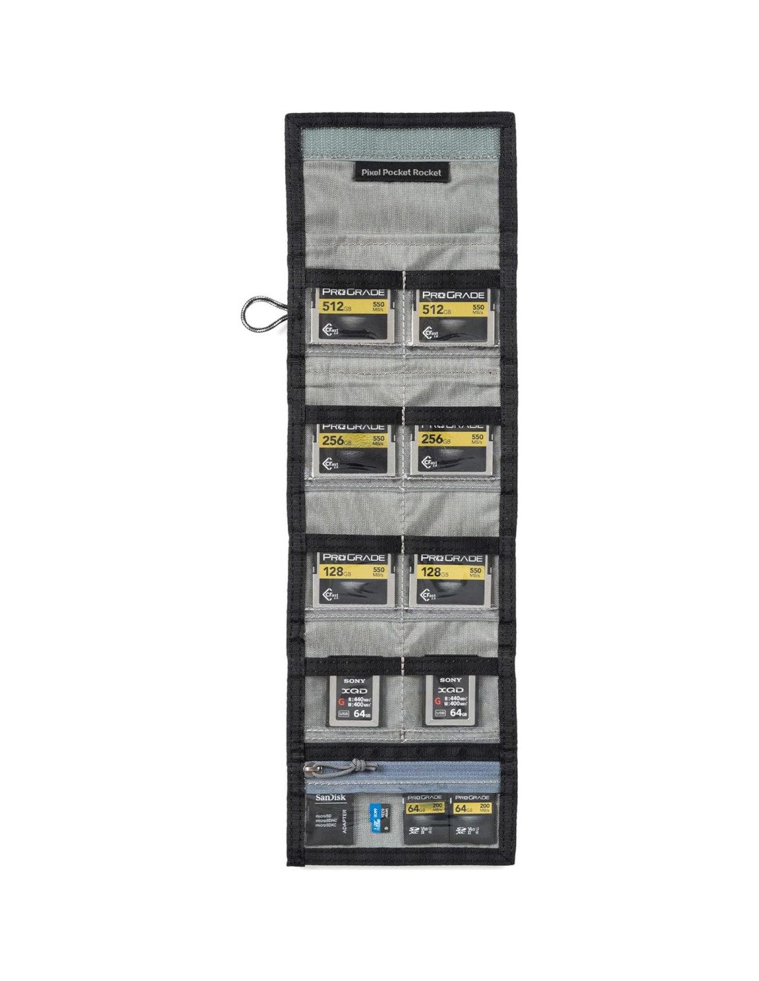 Cartera plegable conveniente para 10 tarjetas de memoria CF o XQD que cabe fácilmente en tu bolsillo o se sujeta a tu cinturón o bolsas.