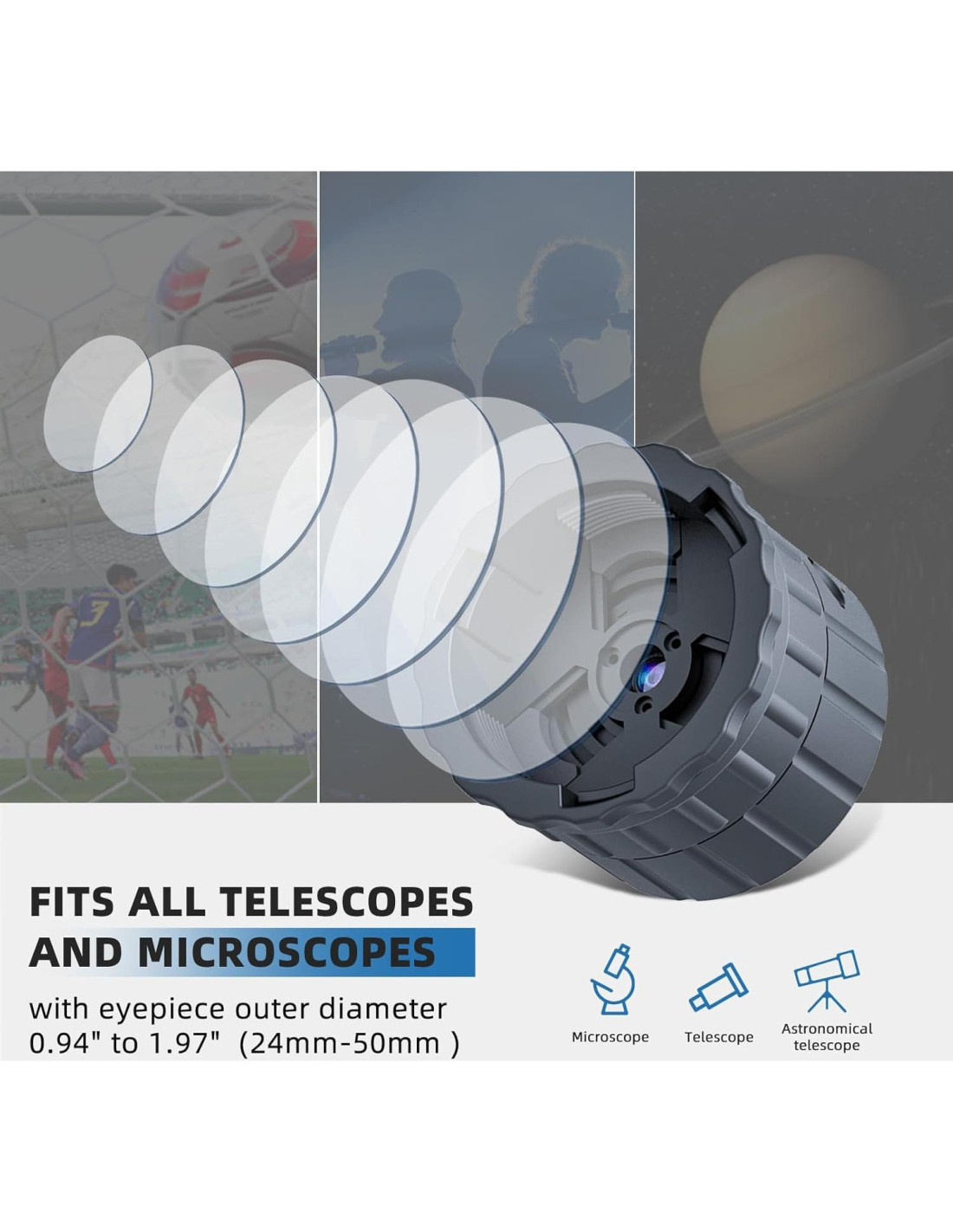- Compatibilidad Versátil: Esta cámara se conecta sin esfuerzo a telescopios ópticos y microscopios con tamaños de ocular que van de 24mm a 50mm. Transforma instantáneamente tu equipo en una cámara de alta calidad, lista para capturar fotos y videos impresionantes del mundo que te rodea.
