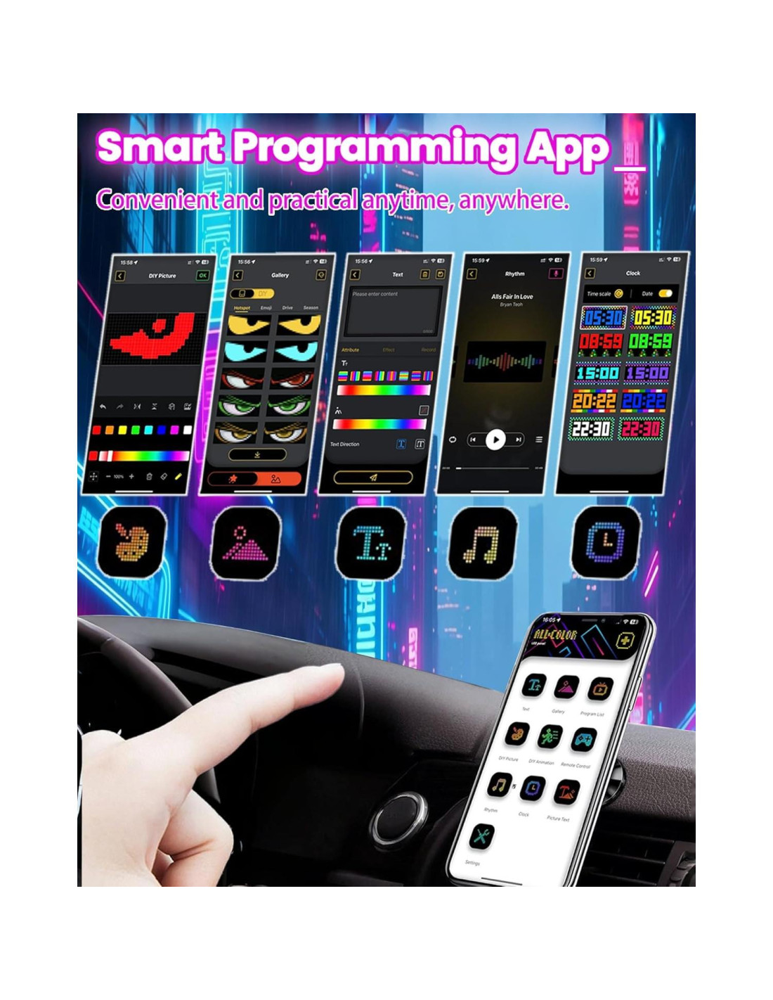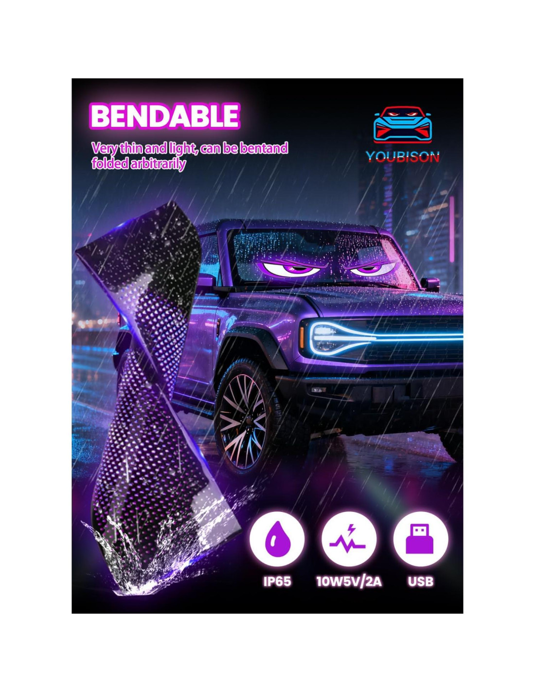 - Desata tu creatividad con personalización impulsada por app. Controla el panel LED flexible sin problemas a través de nuestra app móvil (compatible con iOS y Android). Conéctate a través de Bluetooth para acceder a una personalización ilimitada, edita texto en movimiento, crea diseños originales o sube imágenes y GIFs personalizados. Transforma tu vehículo en un deslumbrante espectáculo de luces DIY que expresa tu estilo único, con contenido siempre disponible que incluye ojos hipnóticos, patrones dinámicos o logotipos personalizados.