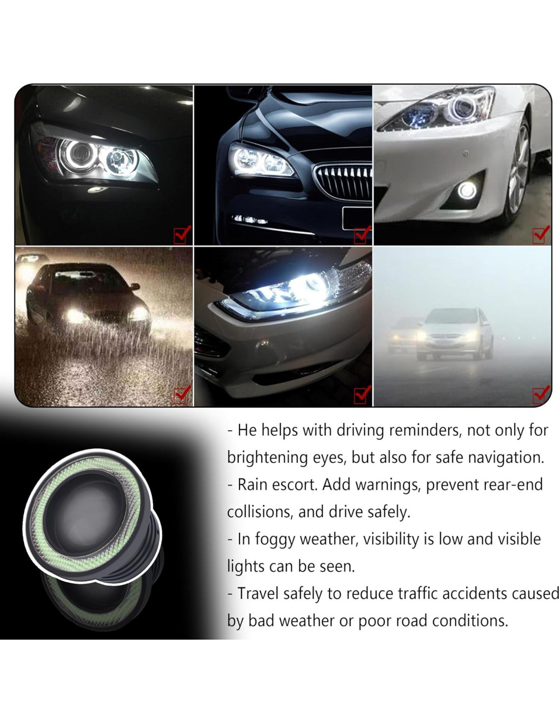 - [Lámpara de Niebla Ojo de Ángel Única] Nuestras luces de niebla halo ojo de ángel son definitivamente un producto imprescindible para la modificación de tu auto o actualización de partes! El medio es una luz LED blanca de alta luminosidad, y el círculo exterior es una fuente de luz COB colorida. El diseño único del ojo de ángel y la apariencia aerodinámica harán que tu auto sea la presencia más deslumbrante en la calle!