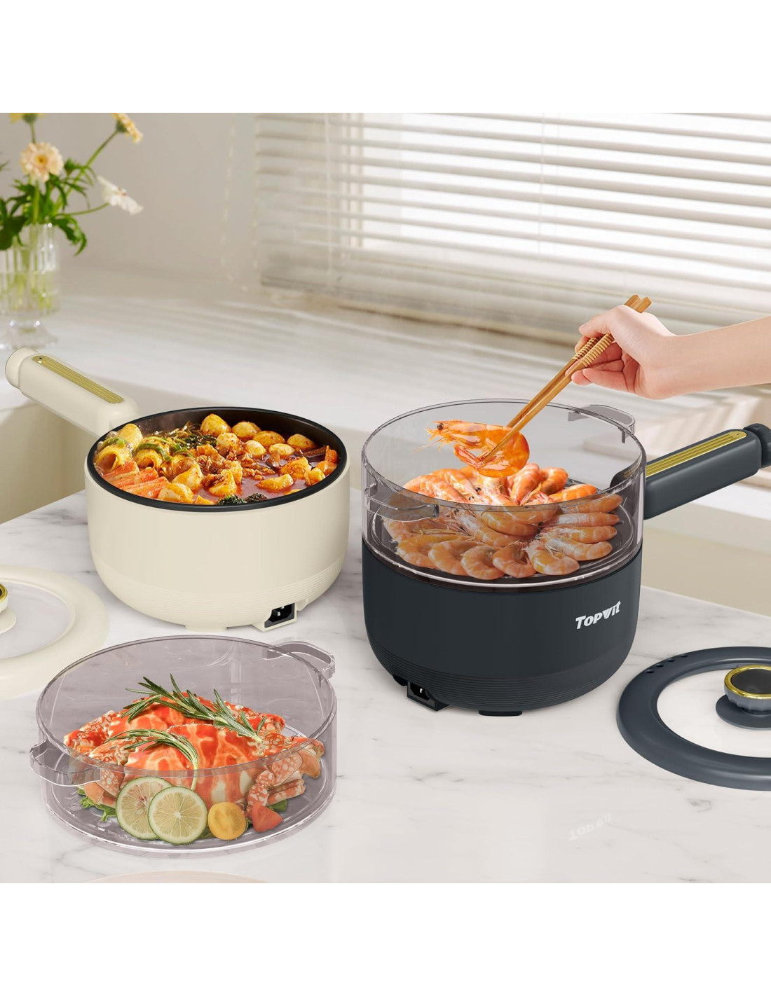 - [Configuración de Doble Potencia] La olla eléctrica TOPWIT viene con configuraciones de doble potencia, permitiéndote controlar fácilmente la temperatura para satisfacer diferentes necesidades de cocción: baja potencia (250W) para hacer huevos fritos, ramen y avena; alta potencia (600W) para bistec, olla caliente, salteado de verduras y más. Puede reemplazar varias estufas y utensilios de cocina tradicionales, brindando más comodidad a tu vida.