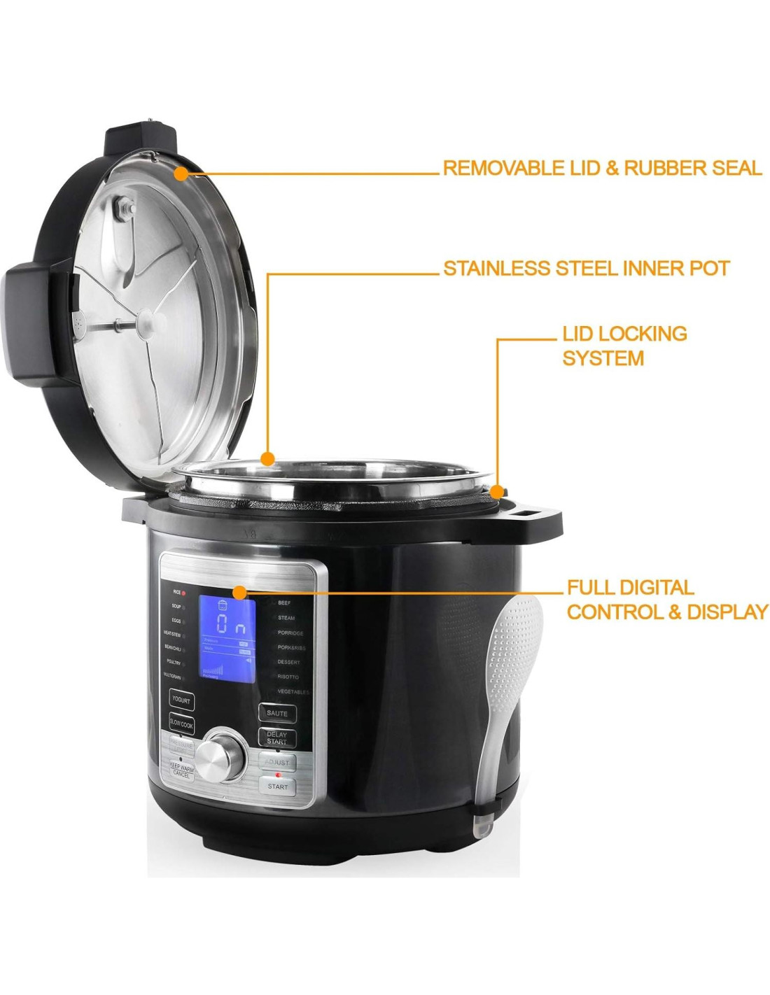 La Megachef Olla de Presión Eléctrica Digital de Acero Inoxidable de 6 Cuartos con Tapa te permite cocinar a tu antojo con 14 características programables integradas. La pantalla digital muestra el tiempo de cocción, luces indicadoras de botones y configuraciones de un toque para ajustar fácilmente el tiempo, la temperatura y la presión. El exterior de acero inoxidable cepillado y el interior extraíble permiten una fácil limpieza y durabilidad. La válvula de liberación de presión fácil y el asa de transporte conveniente incluyen una característica de bloqueo, lo que la hace segura y fácil de transferir. ¡Reemplaza tu olla de presión, olla de cocción lenta, vaporera, arrocera y fabricante de sopas con un solo electrodoméstico!