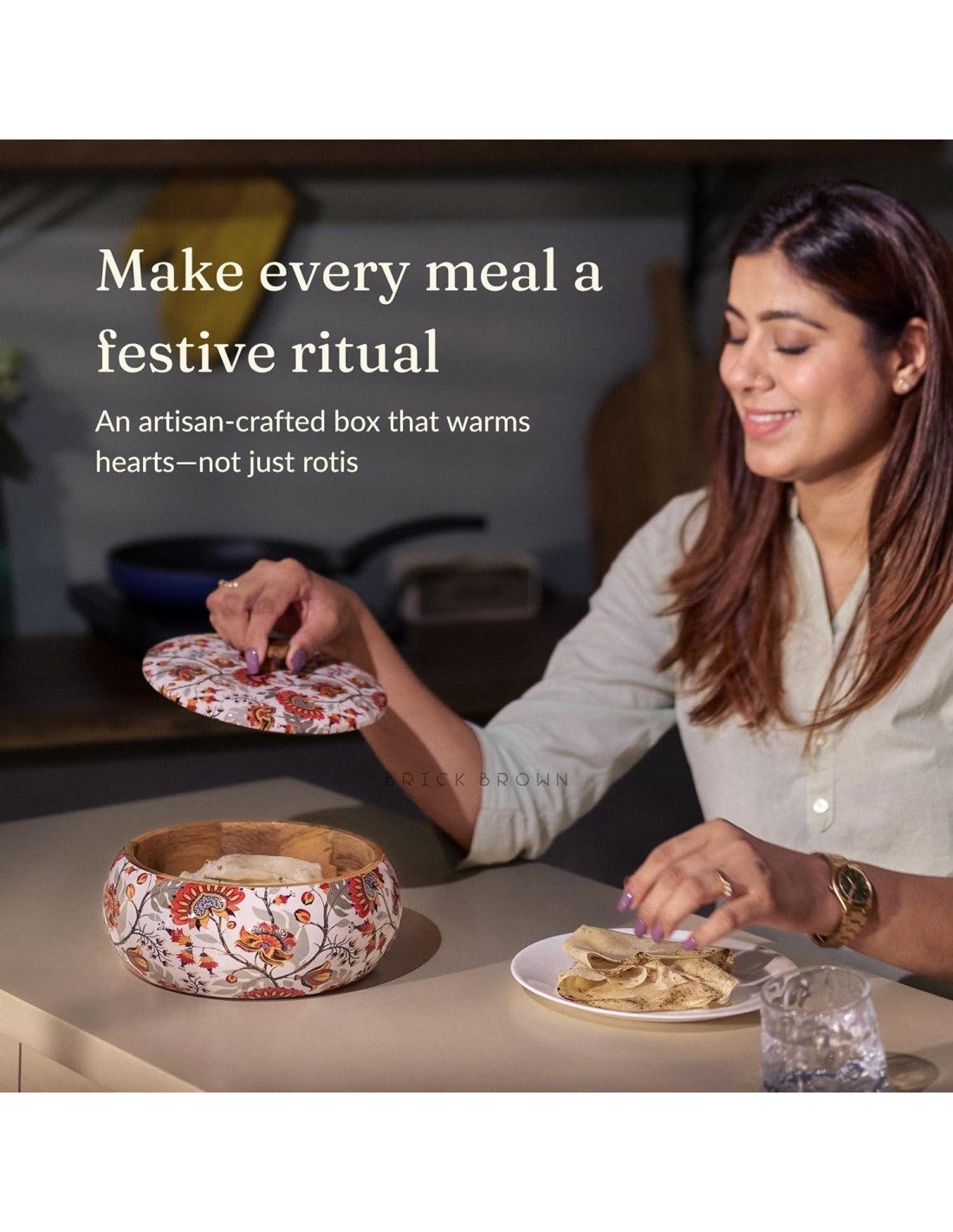 - Tamaño Óptimo para Versatilidad: Mide 22.4x22.4x10.9 cm, haciéndola versátil para almacenar rotis, pan u otros alimentos, manteniéndolos calientes y frescos. | Color: Multicolor | Peso: 0.9 kg | Material: Madera Sólida