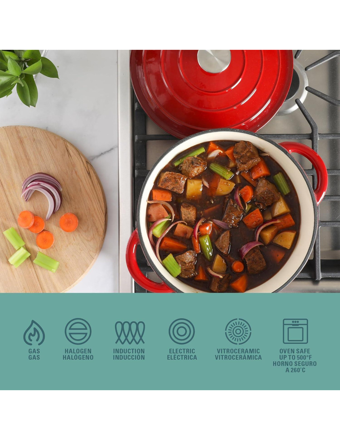 - MEJOR EN VERSATILIDAD: La olla holandesa de hierro fundido es una pieza excepcional de utensilios de cocina para brasear y hornear, freír y saltear, hervir y servir. La construcción resistente promueve una distribución y retención de calor superiores.