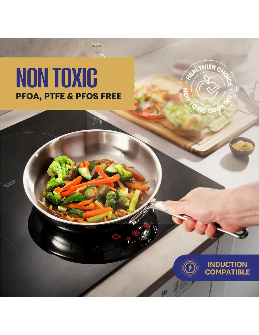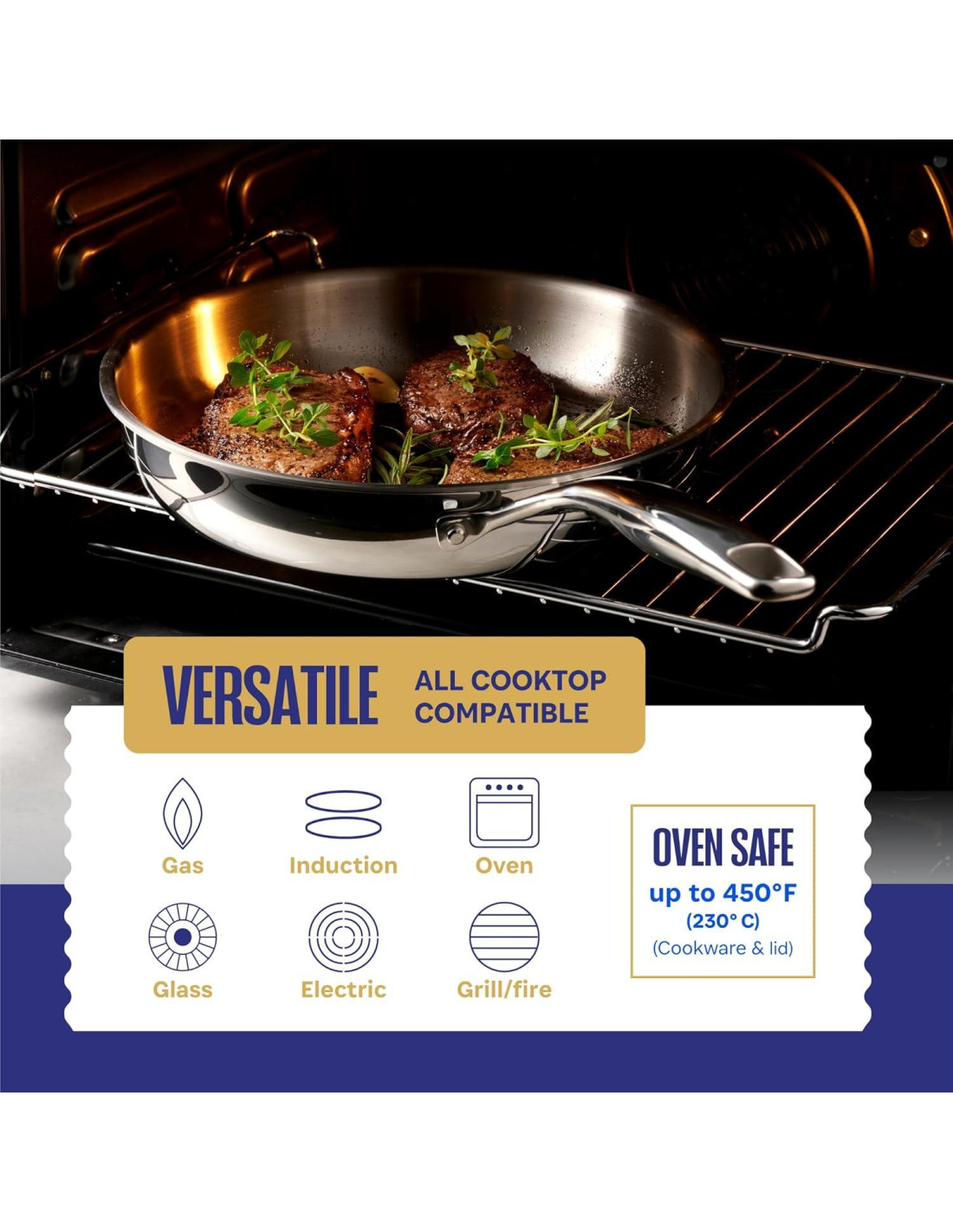 - El juego de utensilios de cocina de acero inoxidable 3 capas de 10 piezas se puede usar con cualquier configuración de cocina: eléctrica, gas, vidrio o inducción. Puede ir de la estufa al horno, para una verdadera cocción de comidas en una sola olla. A prueba de horno hasta 230C (450F). Este conjunto incluye: olla holandesa de 5 cuartos (4,73 litros); sartén de 10 pulgadas (25,4 cm); sartén de 8 pulgadas (20,32 cm); cacerola de 1.5 cuartos (1,42 litros); cacerola de 3 cuartos (2,84 litros); y sartén de 3.5 cuartos (3,31 litros). Todas con tapas pesadas y ajustadas a medida.