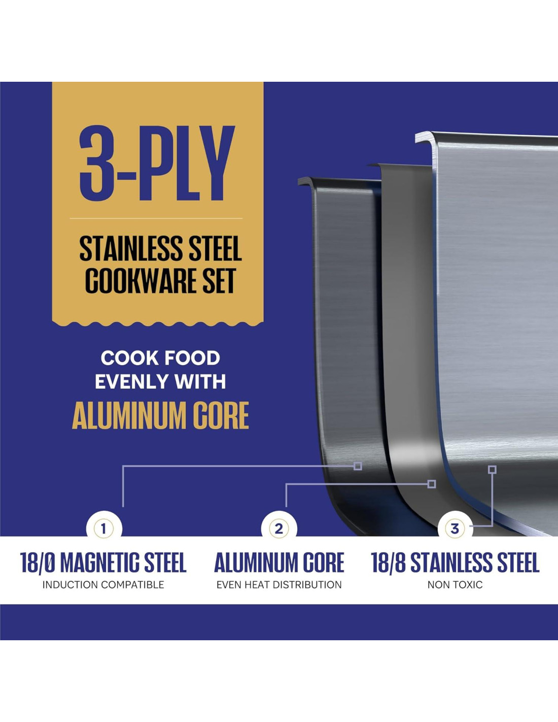 - La tecnología de revestimiento MultiPly produce el juego de ollas y sartenes de acero inoxidable 3 capas de mejor rendimiento. Cada capa de metal premium tiene un propósito: acero inoxidable 304 para una cocción segura y fácil de limpiar; un núcleo de aluminio grueso para un calentamiento uniforme; y acero inoxidable 430 para un rendimiento en todas las cocinas. La distribución del calor a los mangos puede ocurrir durante largos períodos de cocción a alta temperatura. Asegúrese de usar un agarrador al tomar los mangos de las sartenes de acero inoxidable.
