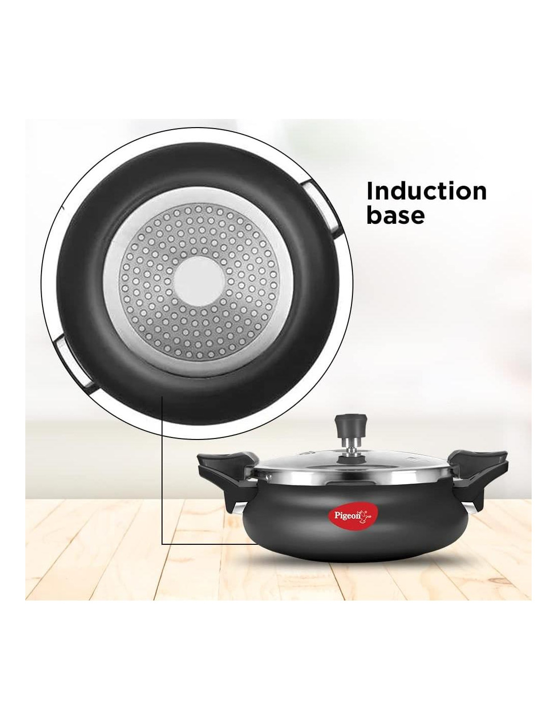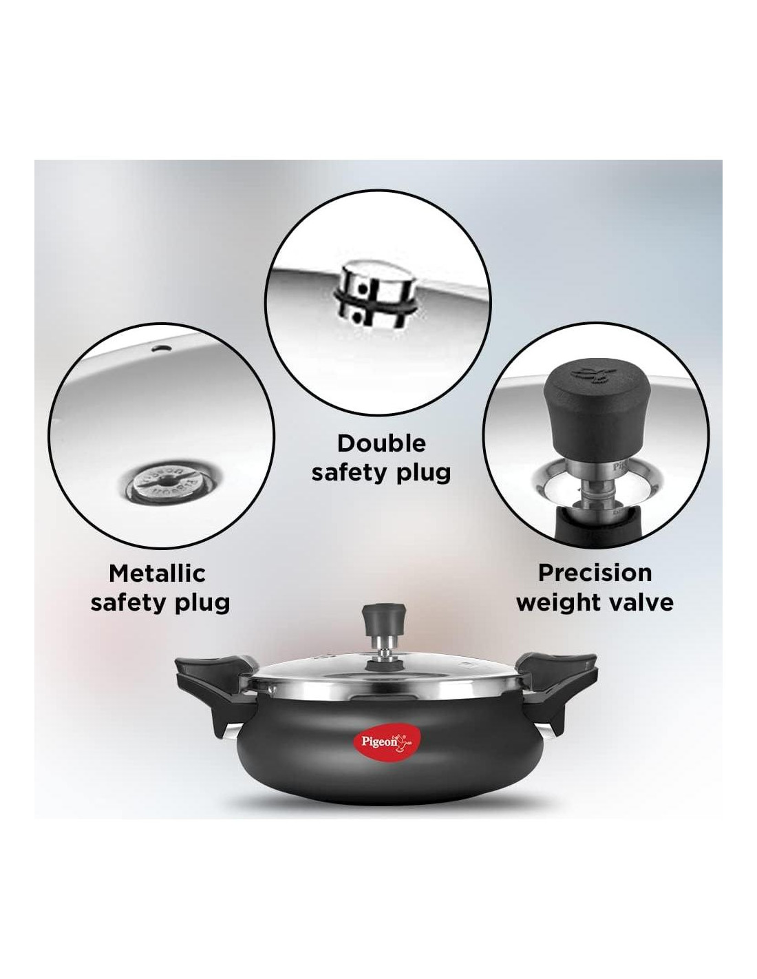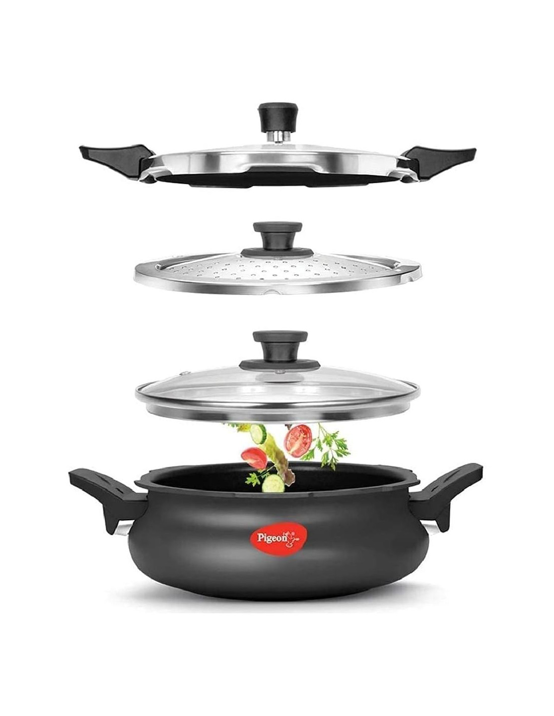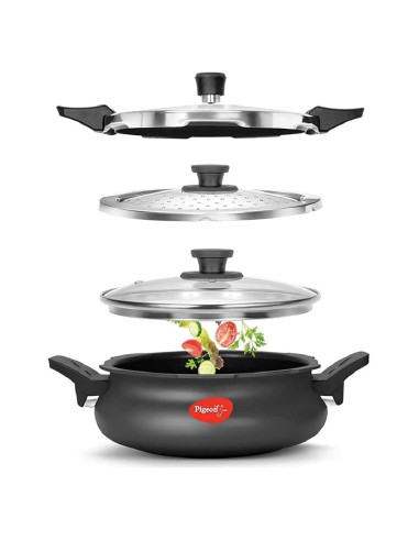 Nuestra olla super todo en uno es un producto multipropósito único con una forma de 'handi' que no solo le da un aspecto muy tradicional, sino que más importante, permite retener el valor nutricional en los alimentos. El cuerpo anodizado duro viene con un recubrimiento antiadherente, que es fácil de limpiar, resistente a rayones, seguro y tiene una vida útil más larga ya que actúa como una capa de protección sobre el cuerpo de la olla. La tapa de 3 capas comprende una tapa de colador, una tapa de servicio y una tapa de cocción a presión.