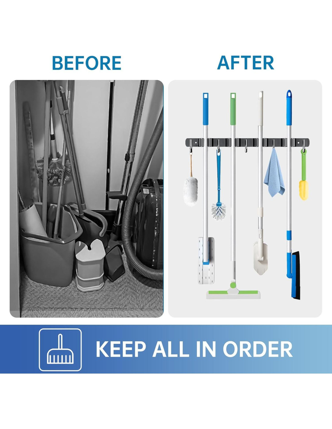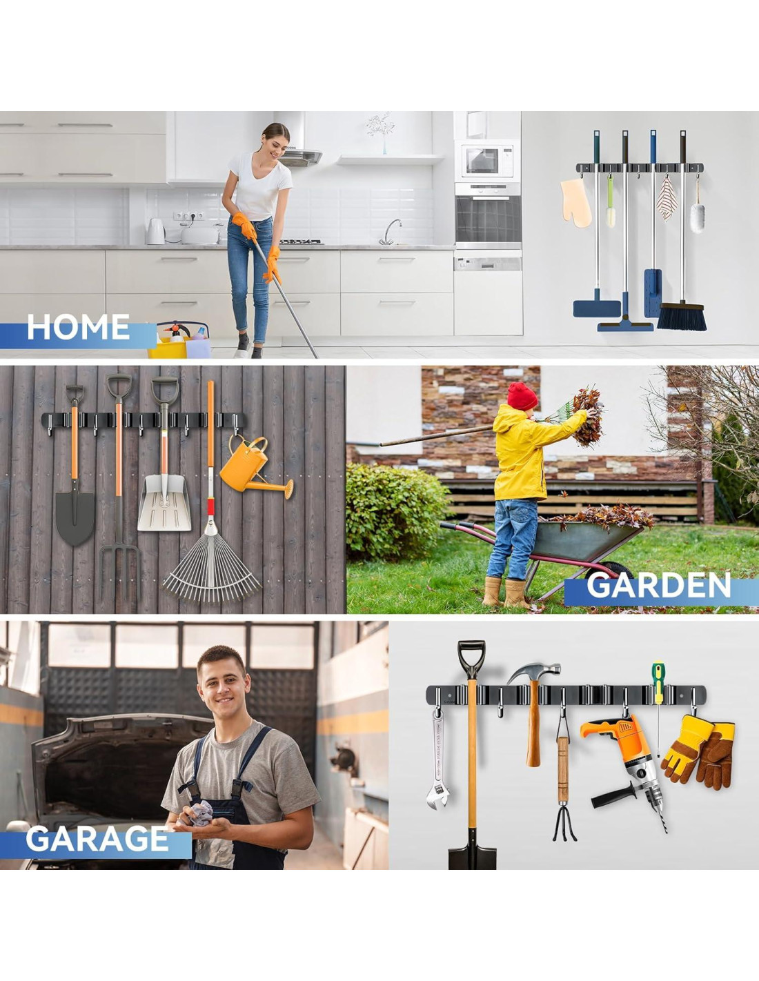 - ORGANIZANDO Y AHORRANDO ESPACIO Nuestro organizador de escobas y mopas colgante en la pared puede mantener los desordenes organizados en pocos minutos. Perfecto para montar su escoba, mopas, rastrillos, cepillos y cualquier otra herramienta, ahorrando espacio para su cocina, garaje, jardín, lavandería, armarios, baño, oficina, comercial, etc.