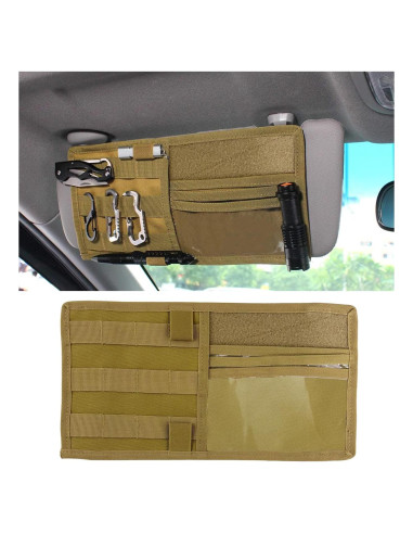 Especificaciones: Material: Nylon Color: Caqui / Verde / Negro Peso: 0.12 kg Tamaño: 33 x 17 cm Característica: Conveniente, Firme, Duradero Aplicabilidad: Ajuste Universal ¿Alguna vez has experimentado el tipo de problema? -Tus credenciales se caerán mientras el vehículo se sacude. -Los artículos están esparcidos y desordenados en los asientos de tu auto. -No pudiste encontrar tu tarjeta de pase al pasar por la caseta de peaje. ¿Qué problema resolverá este organizador de visores de auto para ti? -Puede sostener las credenciales de forma segura, que no se caen fácilmente. -Los artículos están ordenadamente almacenados en el organizador de visores del auto y el interior de tu auto está limpio y ordenado. -Puedes encontrar la tarjeta que necesitas rápida y fácilmente.