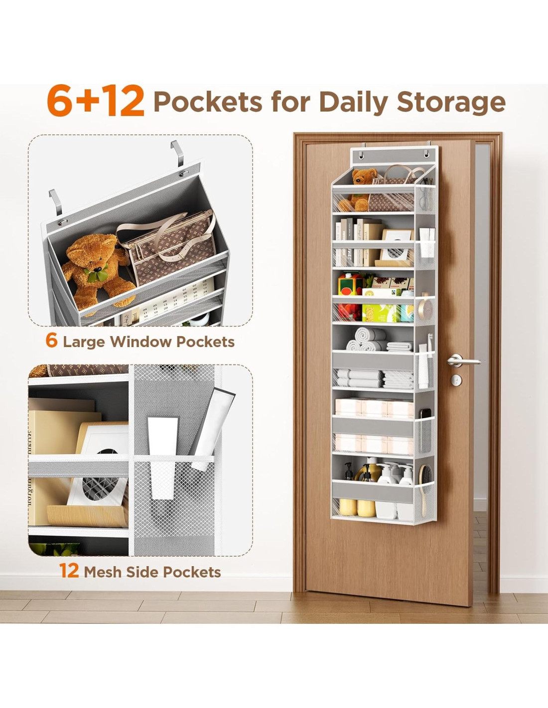 - Organizador Sobre La Puerta de 6 Estantes: El organizador de almacenamiento colgante de 6 niveles tiene un tamaño extra grande, 152.4cm(L) x 38.61cm(W) x 17.27cm(H), con una capacidad de carga máxima de 22.68kg. contiene 6 bolsillos claros extra grandes y 12 bolsillos laterales, proporcionando mucho espacio para organización y almacenamiento.