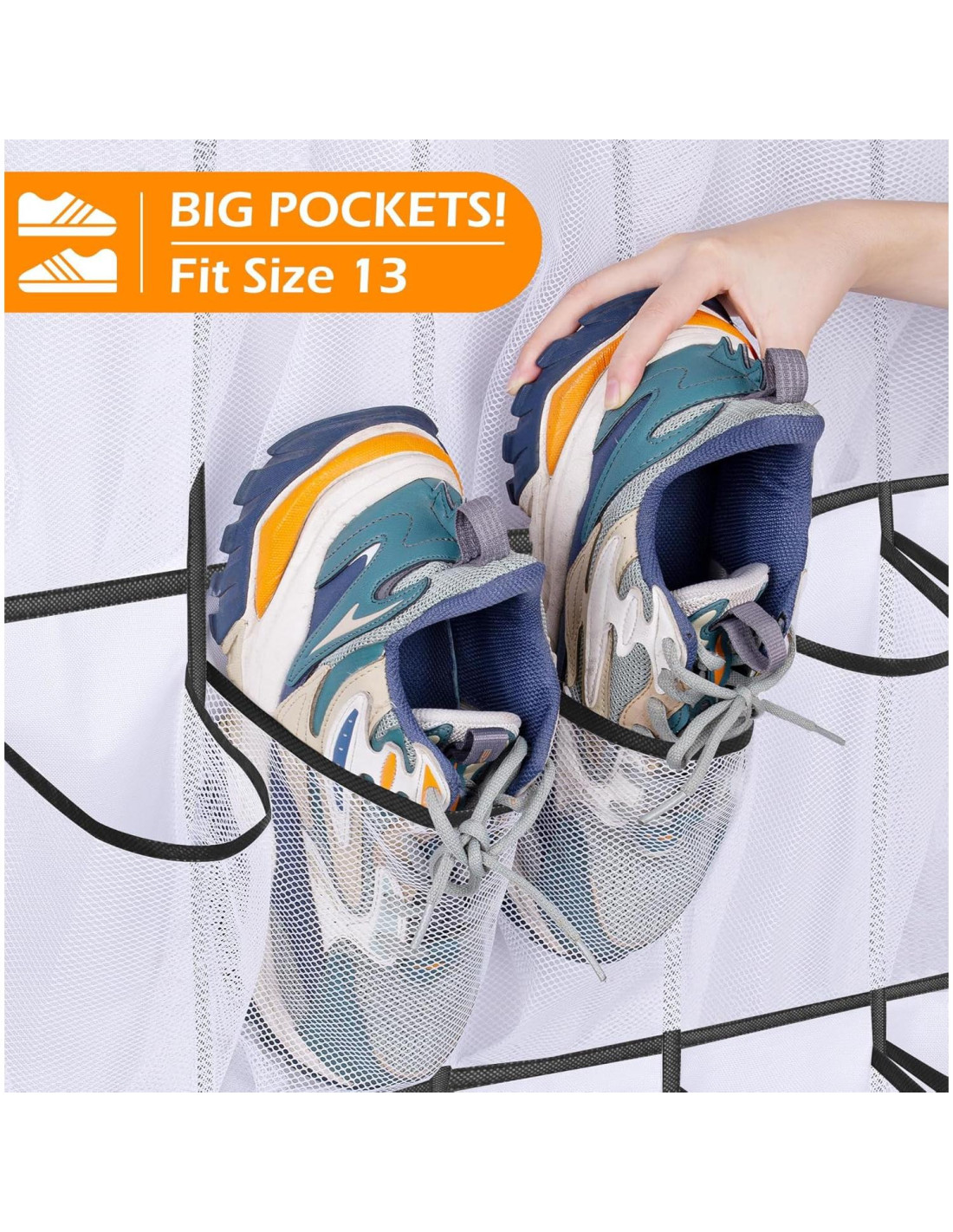 - [ Lo Suficientemente Grande para Sostener un Zapato de Hombre Tamaño 13! ] Los bolsillos del organizador de zapatos del closet son más grandes y profundos que la mayoría de los estantes de zapatos sobre la puerta, para que tus zapatos no se caigan de los bolsillos. El bolsillo es lo suficientemente grande para sostener muchos zapatos, como zapatillas, chanclas, tacones de mujer, zapatos de tenis, zapatos de correr de hombre, etc. Tamaño del bolsillo: 20.07 cm x 11.43 cm
