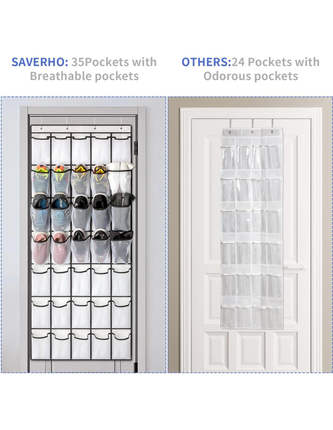 - [35 Bolsillos Profundos] El organizador de zapatos para puerta tiene un total de 35 bolsillos, proporcionando más espacio que los organizadores de zapatos de 24 y 28 bolsillos. puede colgar al menos 17 pares de zapatos y sostener los zapatos de toda tu familia. cada bolsillo es lo suficientemente grande para acomodar zapatos de hombre tamaño 13.
