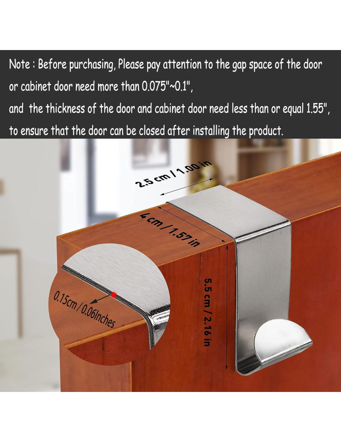 - Los ganchos sobre la puerta se adaptan tanto a puertas residenciales (1.35" / 3.43 cm) como comerciales (1.55" / 3.94 cm) de grosor. Adecuado para la mayoría de las puertas. Si tu puerta o puerta de closet es demasiado estrecha, puedes poner una almohadilla de espuma o cartón para llenar el espacio, (nuestro producto 1set = 2pcs productos incluye 4pcs ganchos para puerta y 2pcs cintas de nylon) con 1pcs hebilla de plástico para ajustar la longitud de la cinta de nylon y 20pcs hebillas de plástico para bloquear los ganchos antideslizantes y 20pcs ganchos para sostener bolsos, gorras, corbatas, etc.) NO INCLUYE LAS ALMOHADILLAS DE ESPUMA O CARTÓN