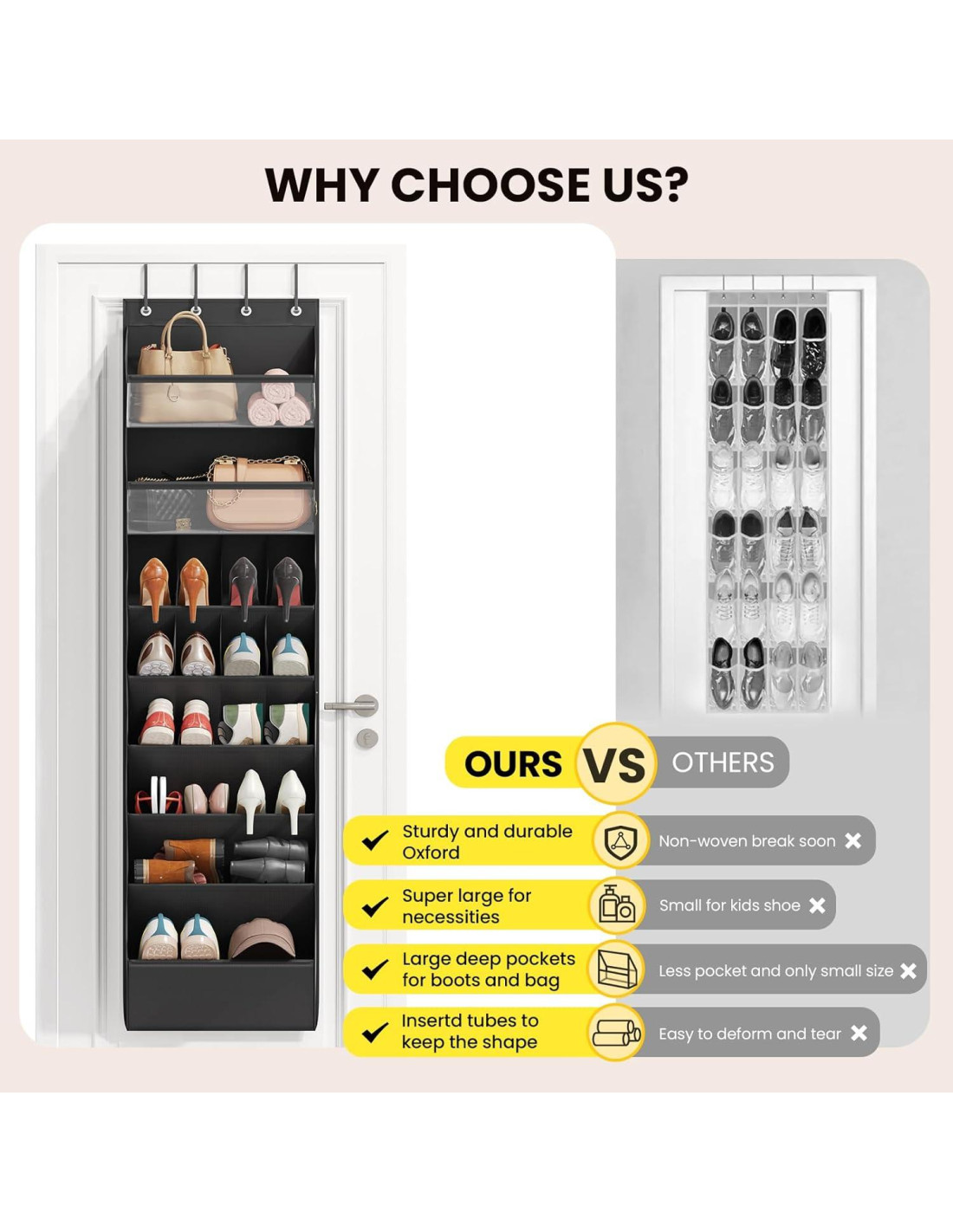 - 8 Compartimentos Extra Grandes en Niveles: Nuestro organizador de zapatos sobre la puerta cuenta con 8 bolsillos profundos y en niveles diseñados para almacenar de 16 a 32 pares de zapatos. Organiza sin esfuerzo 16 botas voluminosas de tamaño 12+, tacones, sandalias o chanclas. Los 2 niveles superiores cuentan con ventanas de PVC transparentes para una rápida visibilidad de los artículos almacenados, ofreciendo un 30% más de capacidad que los organizadores estándar.