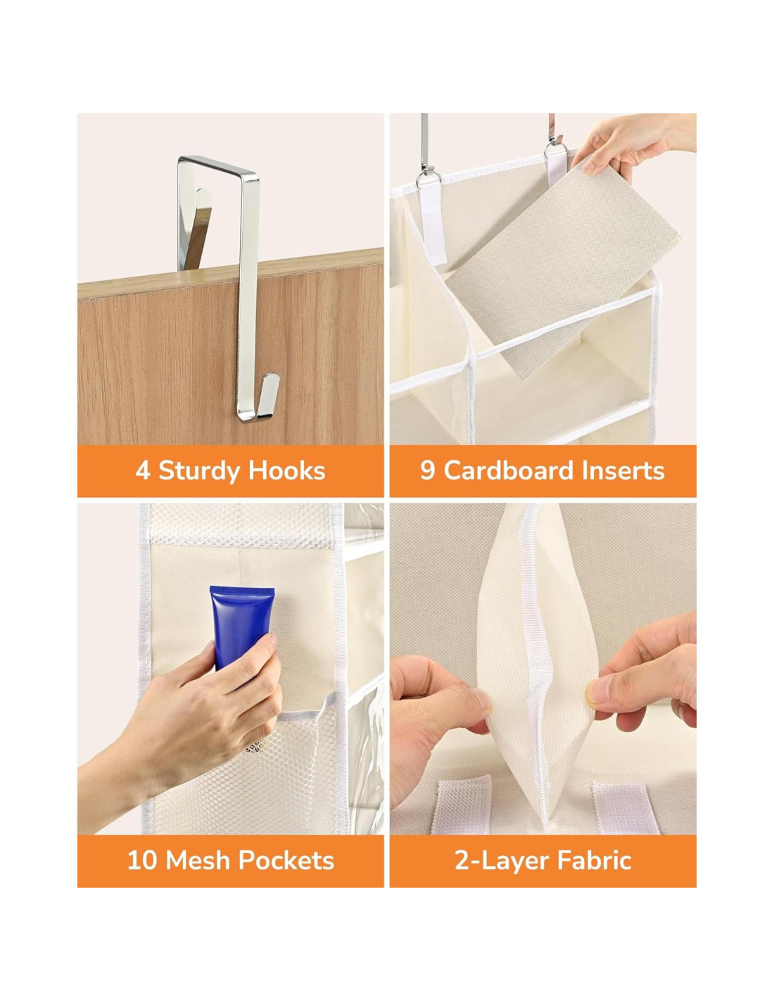 - [Se Ajusta a la Mayoría de las Puertas - Sin Herramientas Requeridas] Equipado con 2 ganchos de metal resistentes, este organizador se ajusta a la mayoría de las puertas interiores estándar (ancho < 4.2 cm). Fácil de colgar - sin perforaciones, sin hardware y sin complicaciones. Ideal para casas de alquiler, residencias estudiantiles o apartamentos.