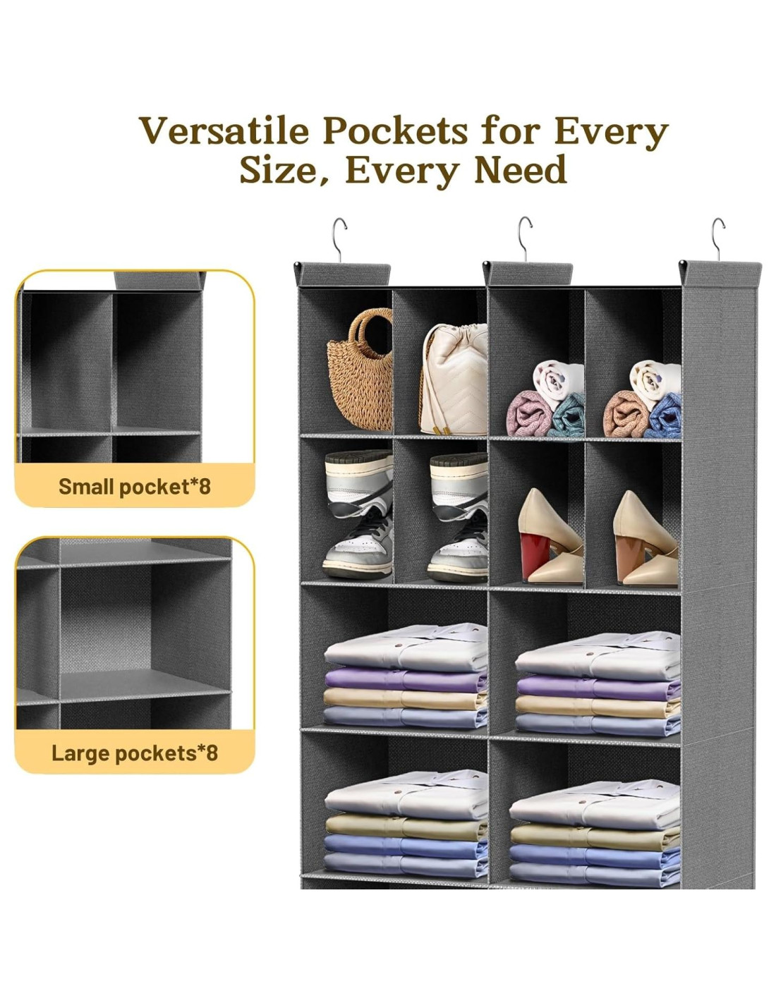 - [Maximiza el Espacio del Closet con el Organizador Colgante de Doble Fila] El diseño de doble fila de este organizador de closet colgante maximiza el espacio de almacenamiento en tu armario, ofreciendo una solución más rentable en comparación con la compra de dos organizadores de fila única. Con estanterías abiertas, mejora la organización del closet al proporcionar excelente accesibilidad y visibilidad, mientras aprovecha al máximo el espacio vertical, ideal para closets pequeños.