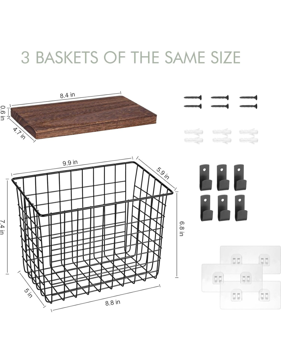 - Componentes incluidos: 3 x Pegatinas Adhesivas, 3 x Cestas Colgantes de Pared, 6 x Juego de Ganchos de Tornillo, 3 x Tablas de Madera