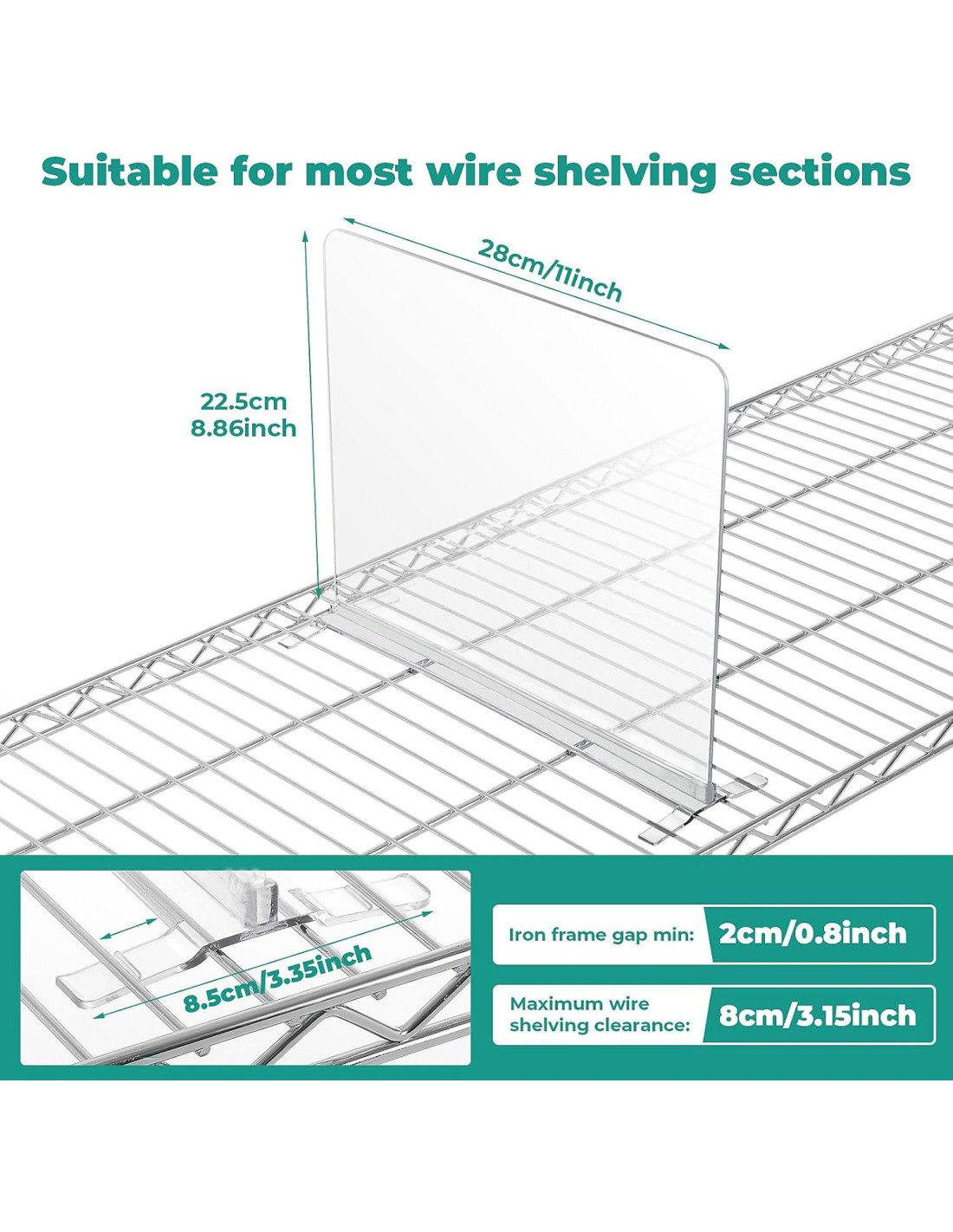- Fácil Instalación y Remoción: Es ligero, fácil de instalar, fácil de quitar, y se puede asegurar a cualquiera de tus sistemas de estanterías de alambre. Los divisores de estante de alambre están hechos de acrílico claro y vienen con un clip de soporte de 8.5 cm de largo que se engancha en el estante de alambre y toma menos de cinco minutos para instalar, y el agarre de cada divisor no es demasiado apretado ni demasiado suelto, por lo que pueden permanecer en su lugar, pero también se pueden quitar fácilmente para ajustarse a tu espacio preferido.