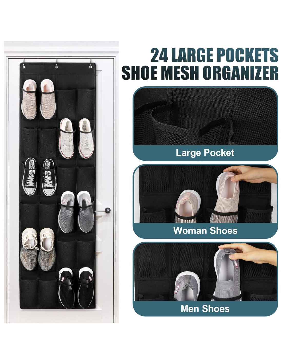 - RECIBIRÁS: 1 estante de zapatos para la entrada de la puerta, 3 ganchos sobre la puerta, 3 cintas adhesivas de doble cara. Cada bolsillo mide 24.13 cm de alto y 10.92 cm. Consejos: los zapatos de adulto en una bolsa para poner un zapato son más convenientes de tomar y poner. Si tienes alguna pregunta, no dudes en contactarnos, te responderemos dentro de 24 horas.