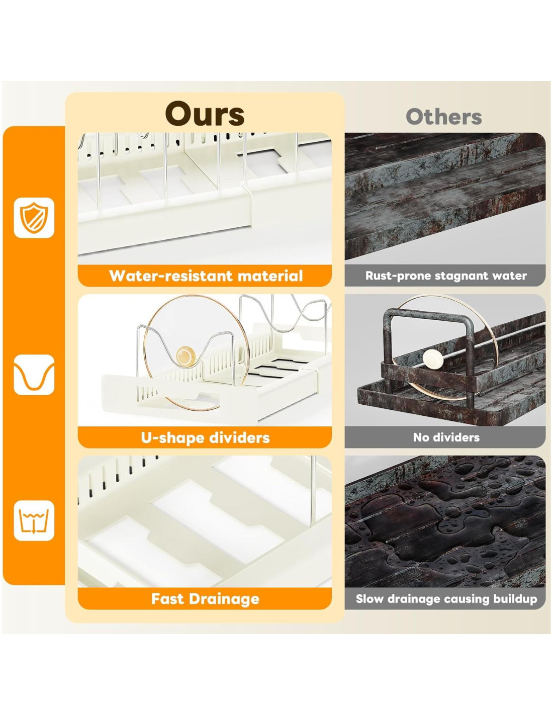 - [Mayor Capacidad de Peso & Estable] Este duradero organizador de ollas y tapas cuenta con una robusta construcción de ABS reforzada con 10 varillas de acero inoxidable de alta calidad, ofreciendo un soporte confiable para tus utensilios de cocina. Su innovador diseño de ranura en forma de U acomoda de manera segura la mayoría de los tamaños de tapa mientras previene deslizamientos o caídas, manteniendo tu cocina ordenada con máxima estabilidad.