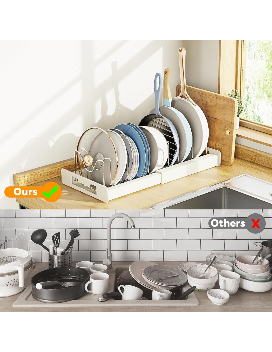 - [Ahorro de Espacio] Este versátil organizador de estante para ollas ofrece la solución definitiva de ahorro de espacio para cocinas de todos los tamaños, almacenando ordenadamente ollas, sartenes, tapas, platos, moldes para pasteles, tablas de cortar y bandejas para hornear. Perfecto para gabinetes, encimeras, despensas o incluso debajo de los fregaderos, su diseño multifuncional maximiza la eficiencia de almacenamiento mientras transforma instantáneamente espacios desordenados en áreas de cocina organizadas.