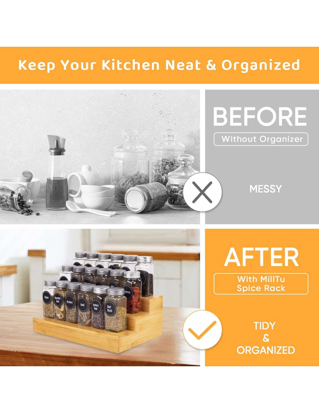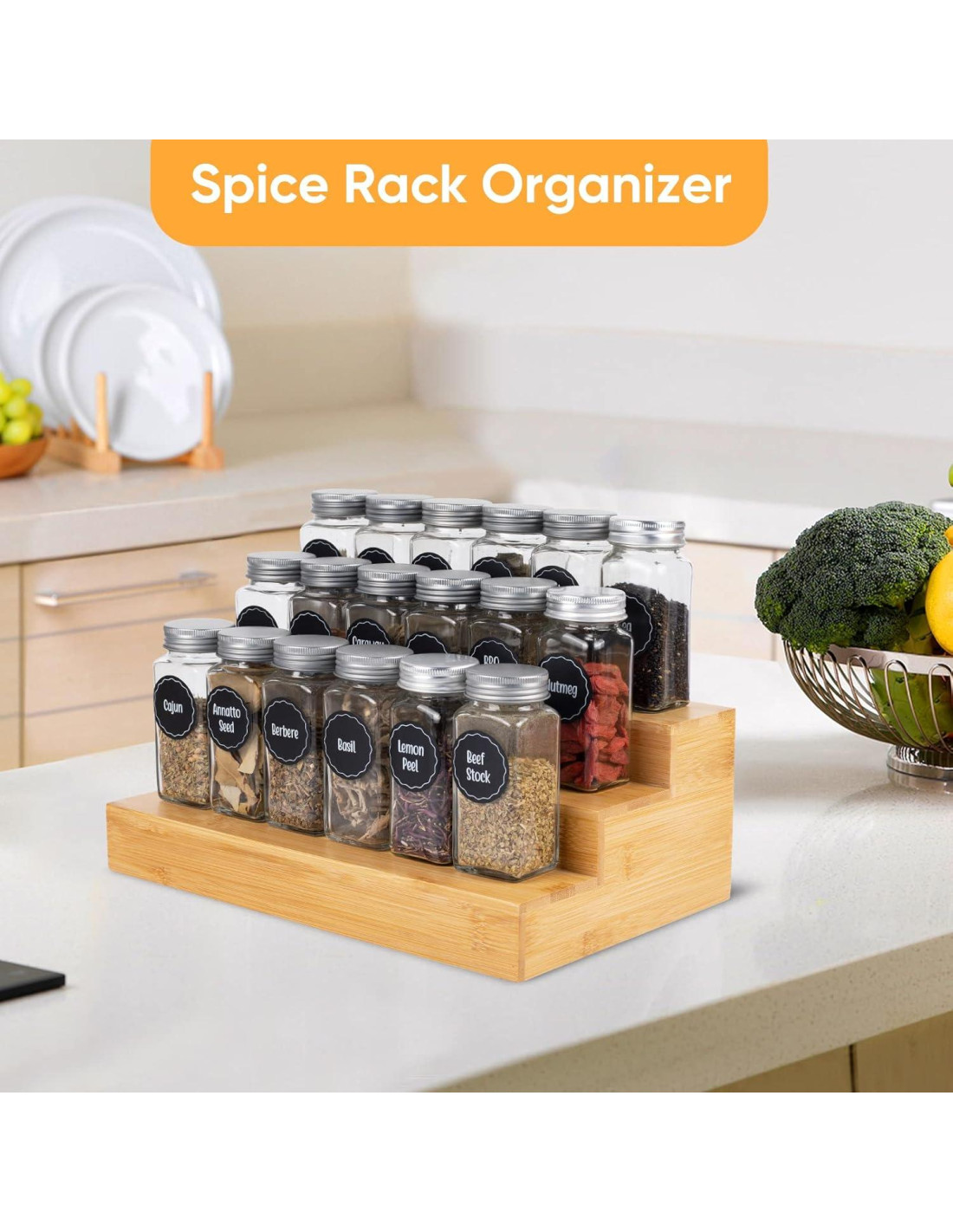 - Paquete: Incluye 2 estantes escalonados de bambú. Con el diseño escalonado, puedes encontrar lo que buscas mucho más rápido y maximizar el espacio de tu gabinete o mostrador.
