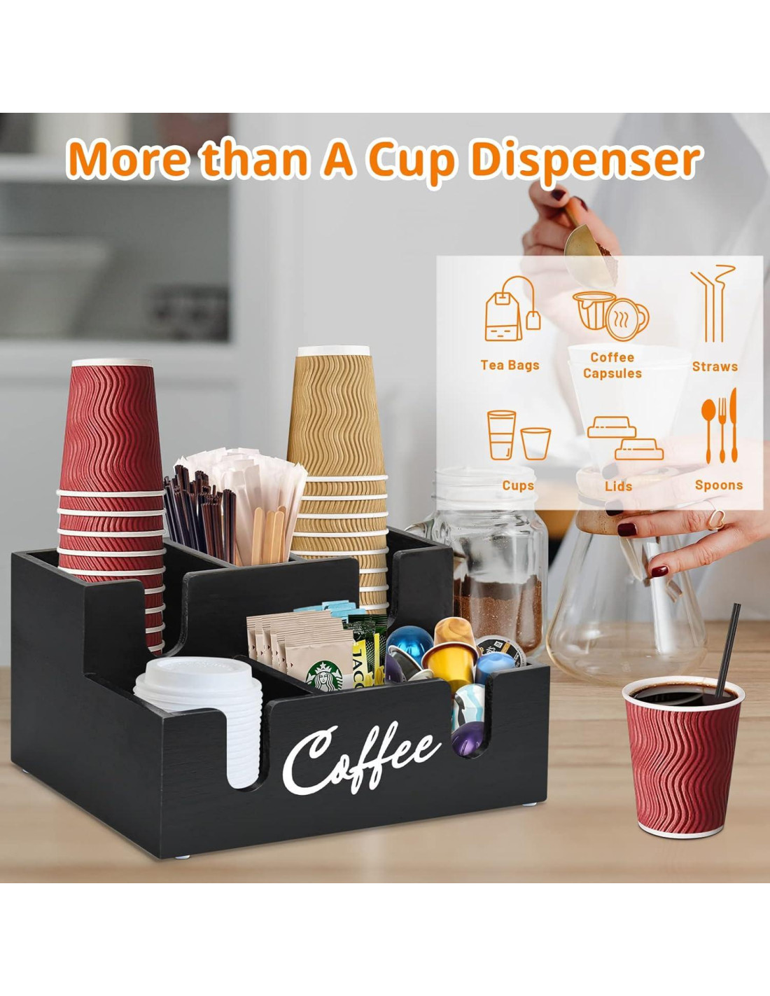 - [AMPLIA APLICACIÓN Y MÚLTIPLES ESCENARIOS] : Esta caja decorativa dispensadora de vasos de café se puede colocar en el vestíbulo del hotel, área de servicio de desayuno de motel, encimera de cocina del hogar o lugar de trabajo. Puedes usar el soporte para caja de cápsulas para completar fácilmente el trabajo de organización. Un regalo para los amantes del café es la mejor opción para ahorrar espacio y resolver problemas de almacenamiento. La decoración del bar de café hace que los condimentos se vean geniales.