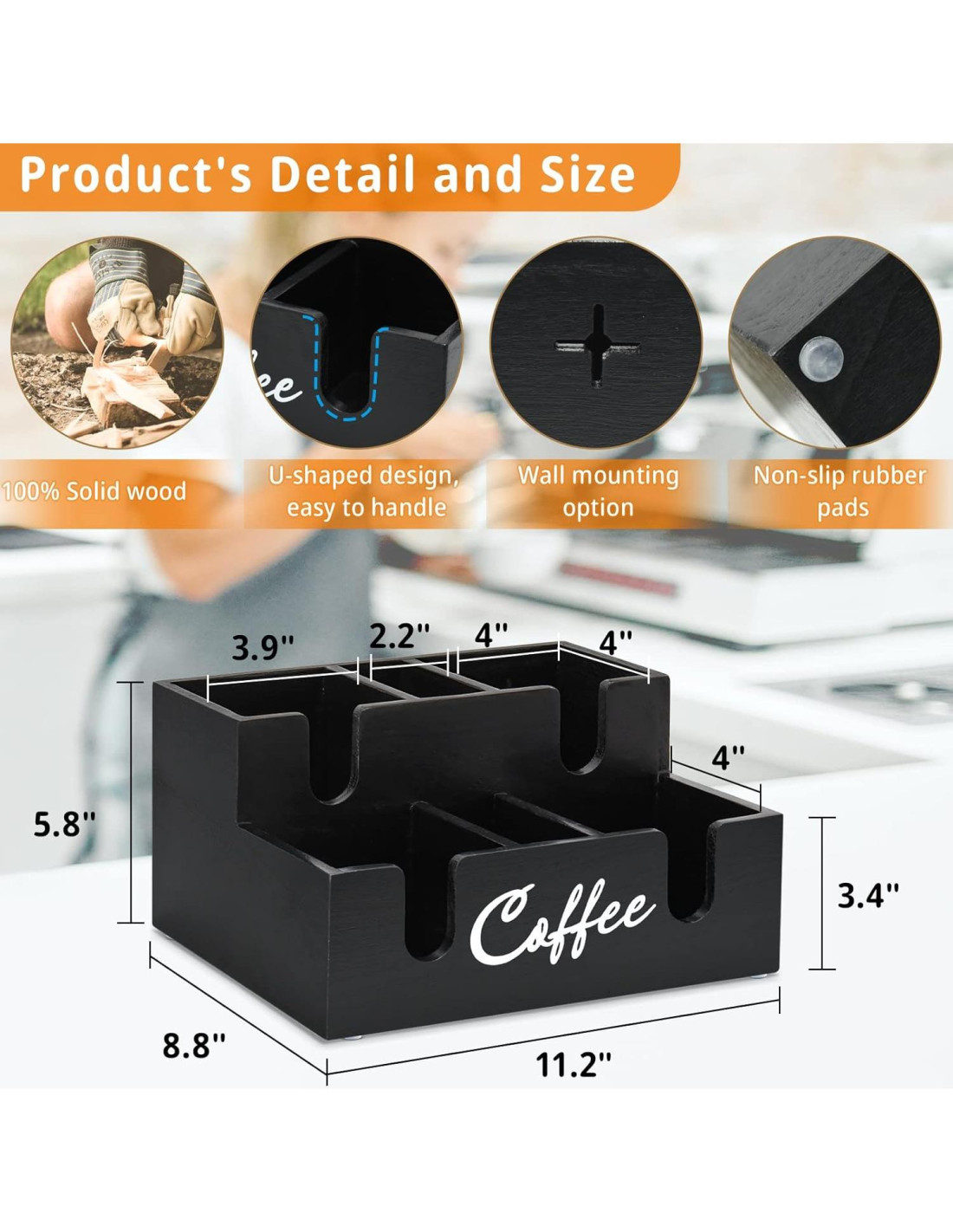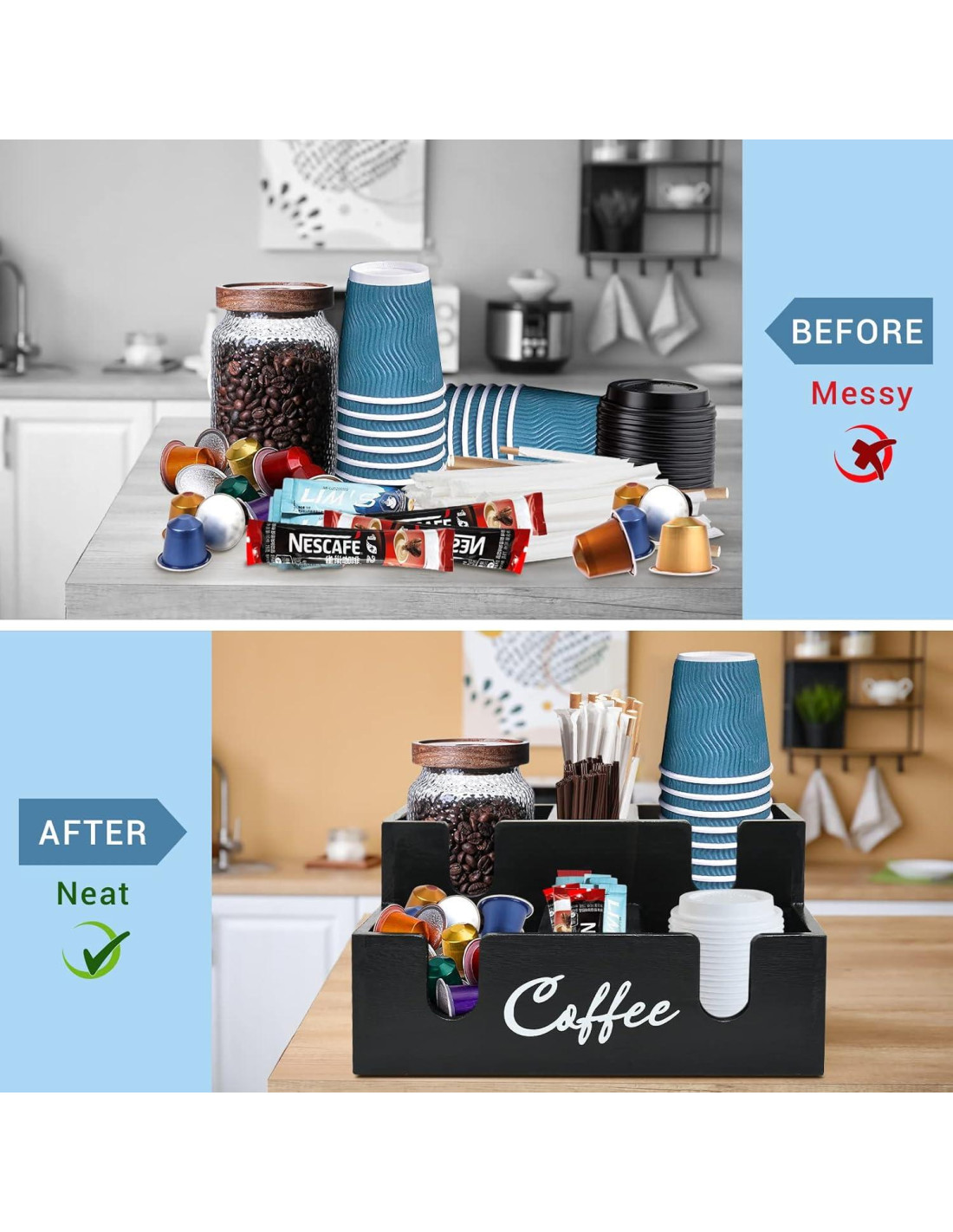- [Accesorios y organizador de bar de café duraderos] : El organizador de estación de café para encimera está hecho de madera sólida premium y duradera y puede ser utilizado por mucho tiempo. La caja de almacenamiento de vasos de café, tapas y popotes ocupa el menor espacio en la encimera y la mesa de café. Los accesorios de bar de café multifuncionales son muy fáciles de limpiar y cuidar. Solo limpia con un paño húmedo para eliminar los residuos o líquidos en el almacenamiento de bar de café de madera. Para mejores resultados, mantén seco completamente.