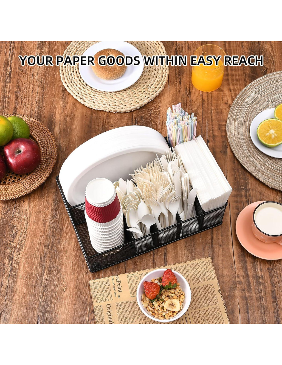 - Organizador de Platos de Papel Versátil Este práctico organizador cuenta con 6 compartimentos, proporcionando un lugar perfecto para tus platos, tazas, utensilios y servilletas. Mantiene todo ordenado y fácilmente accesible.