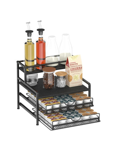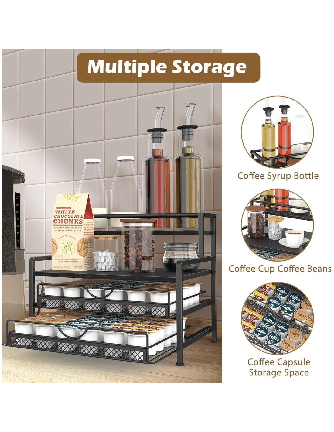 - Estación de 72 K Cups: Nuestra estación de café de 3 niveles con dos cajones sostiene hasta 72 cápsulas de café, sus suministros de café siempre están limpios, higiénicos, organizados y al alcance, y el diseño de escalón removible le permite asegurar la cafetera a una tabla de madera cuando no necesita almacenar otros artículos.