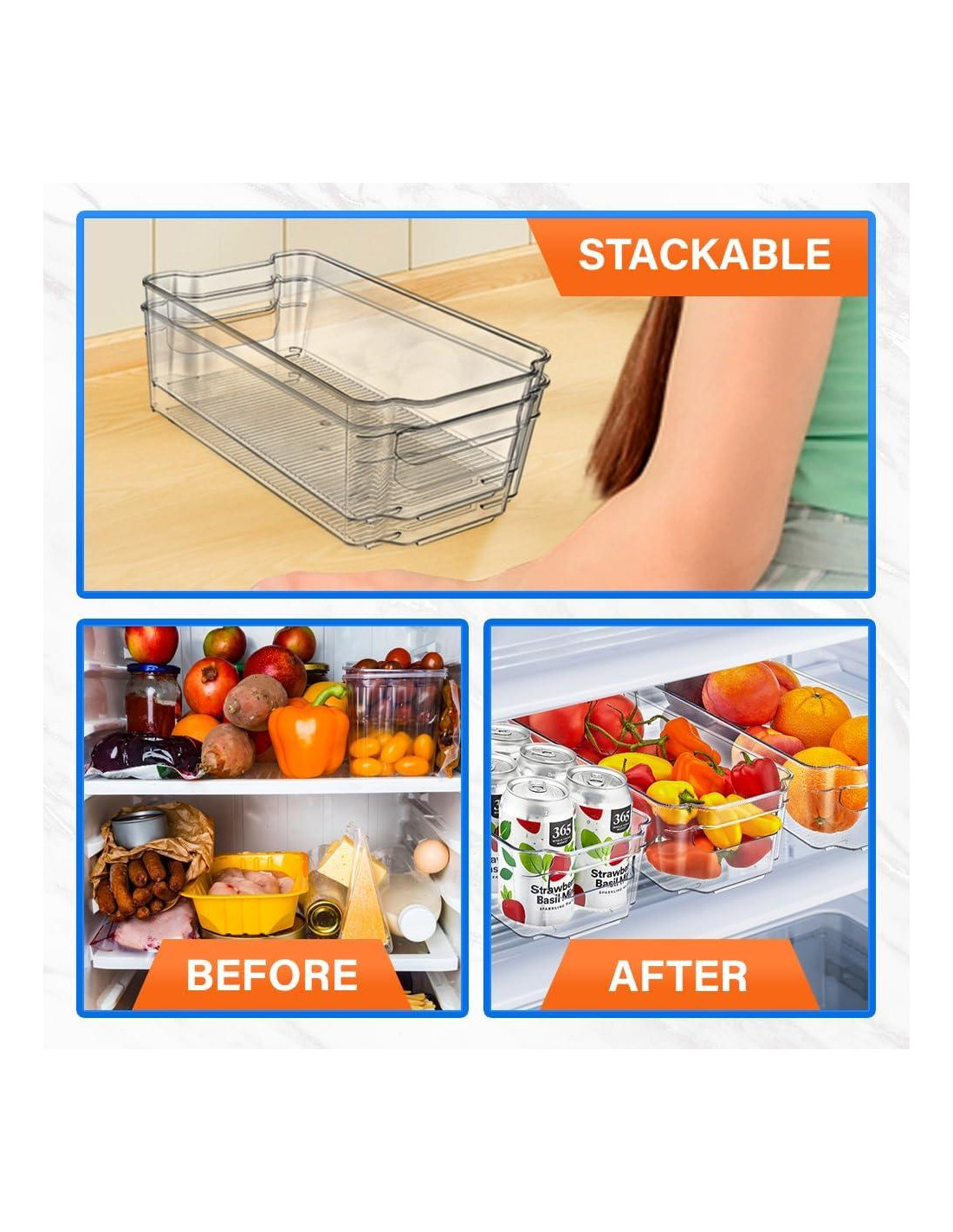 - Duraderos y apilables: Nuestros bins organizadores apilables para refrigerador maximizan el espacio vertical, ayudándote a crear un refrigerador o despensa elegante y ordenada. ¡Disfruta de una organización eficiente sin sacrificar la estética!