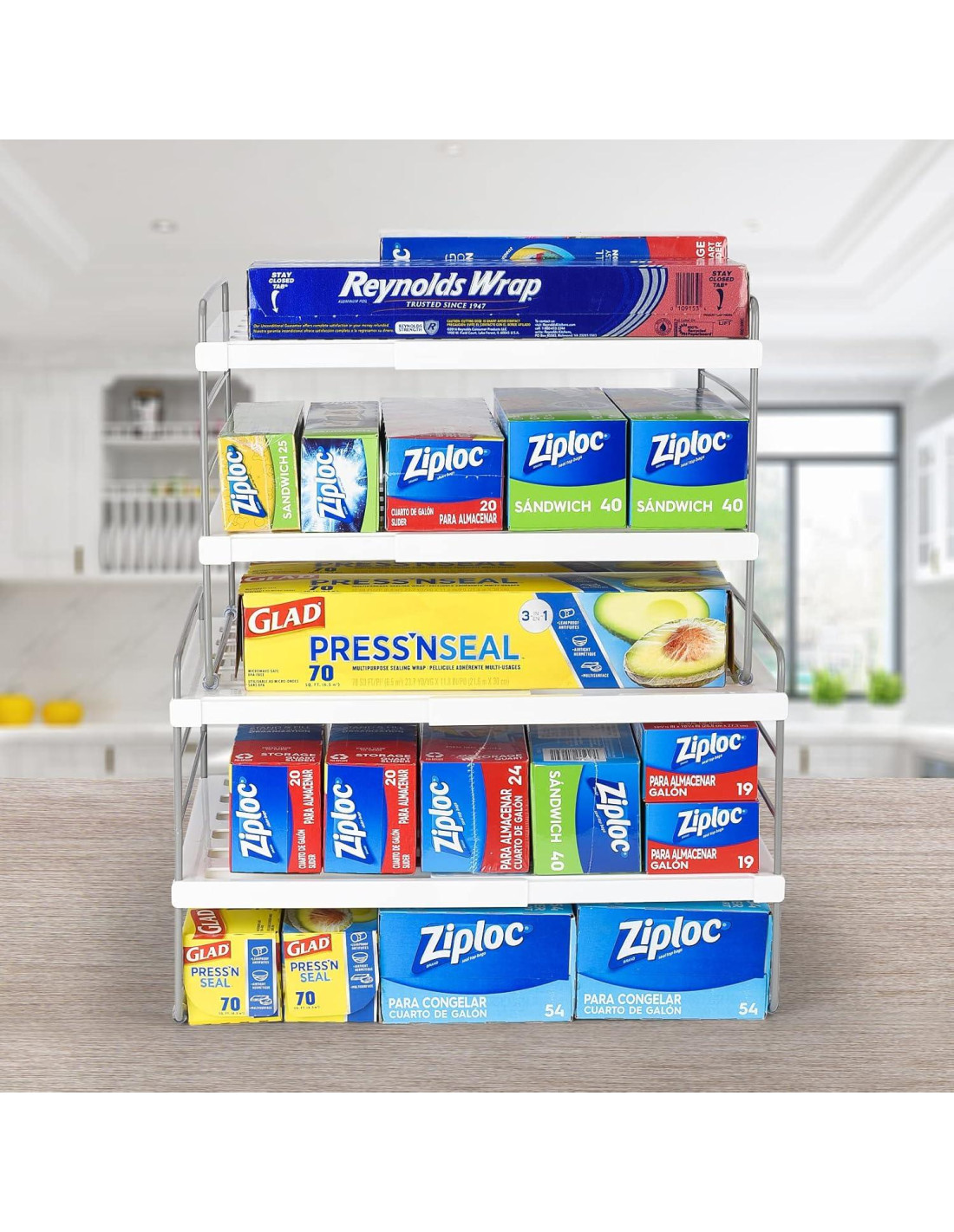 - DISEÑO AJUSTABLE Y EXPANDIBLE: Nuestro organizador de papel de aluminio y envoltura plástica expandible se puede extender de 9.8" a 15.6", y se puede ajustar a cuatro alturas diferentes (3.9 a 8.9 pulgadas) para maximizar el área de almacenamiento y el espacio vertical, ajustándose flexiblemente para satisfacer diferentes necesidades de almacenamiento.