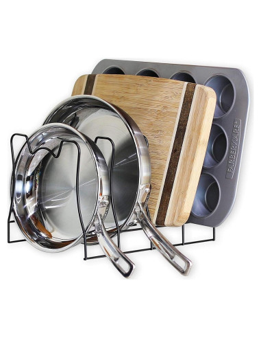 - Gran organizador de sartenes para ahorrar espacio en armarios y encimeras, almacena hasta 4 sartenes