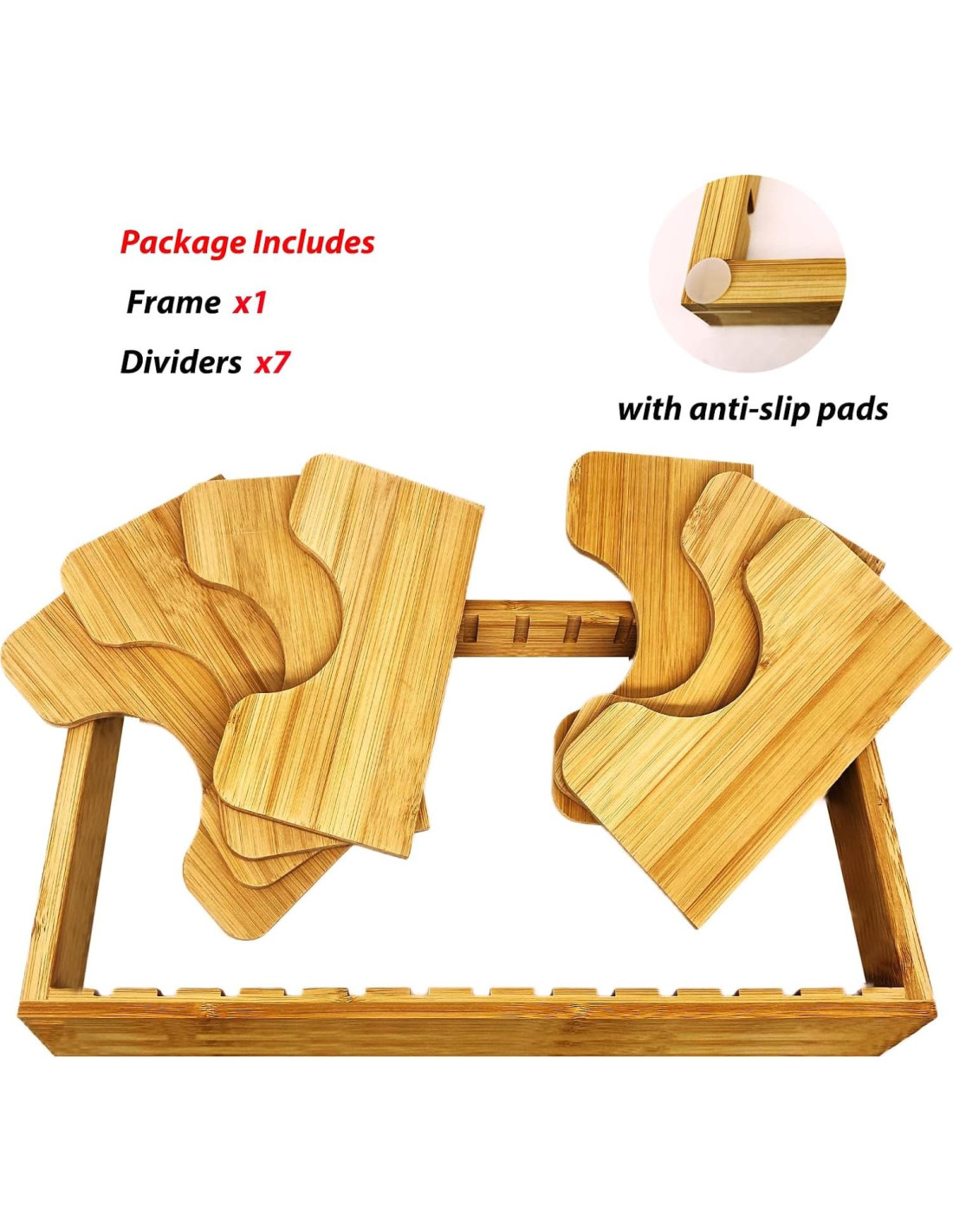 - Diseño: 1. Divisores Ajustables - Los 7 divisores removibles y 13 compartimentos personalizables hacen que este organizador sea increíblemente versátil. Personaliza los compartimentos para ollas, tapas o bandejas para hornear. 2. Construcción de Bambú Duradero - Resistente a la humedad y a los arañazos para uso diario. 3. Ahorro de Espacio y Seguro - diseño con base antideslizante se adapta a muchos espacios.