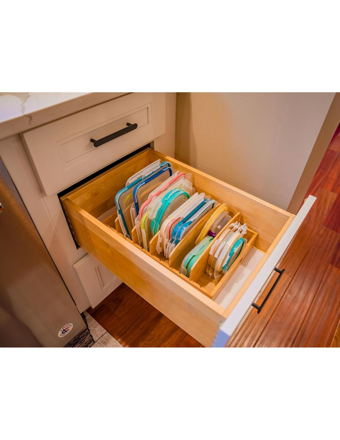 - ORGANIZADOR PARA TAPAS GRANDES: Comparado con otros organizadores de tapas de contenedores de alimentos, este está equipado con divisores más altos, ideal para tapas de cierre a presión grandes (10" (25.4 cm) y aún más grandes).